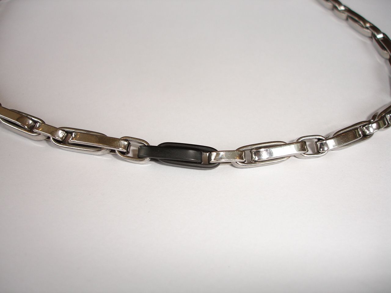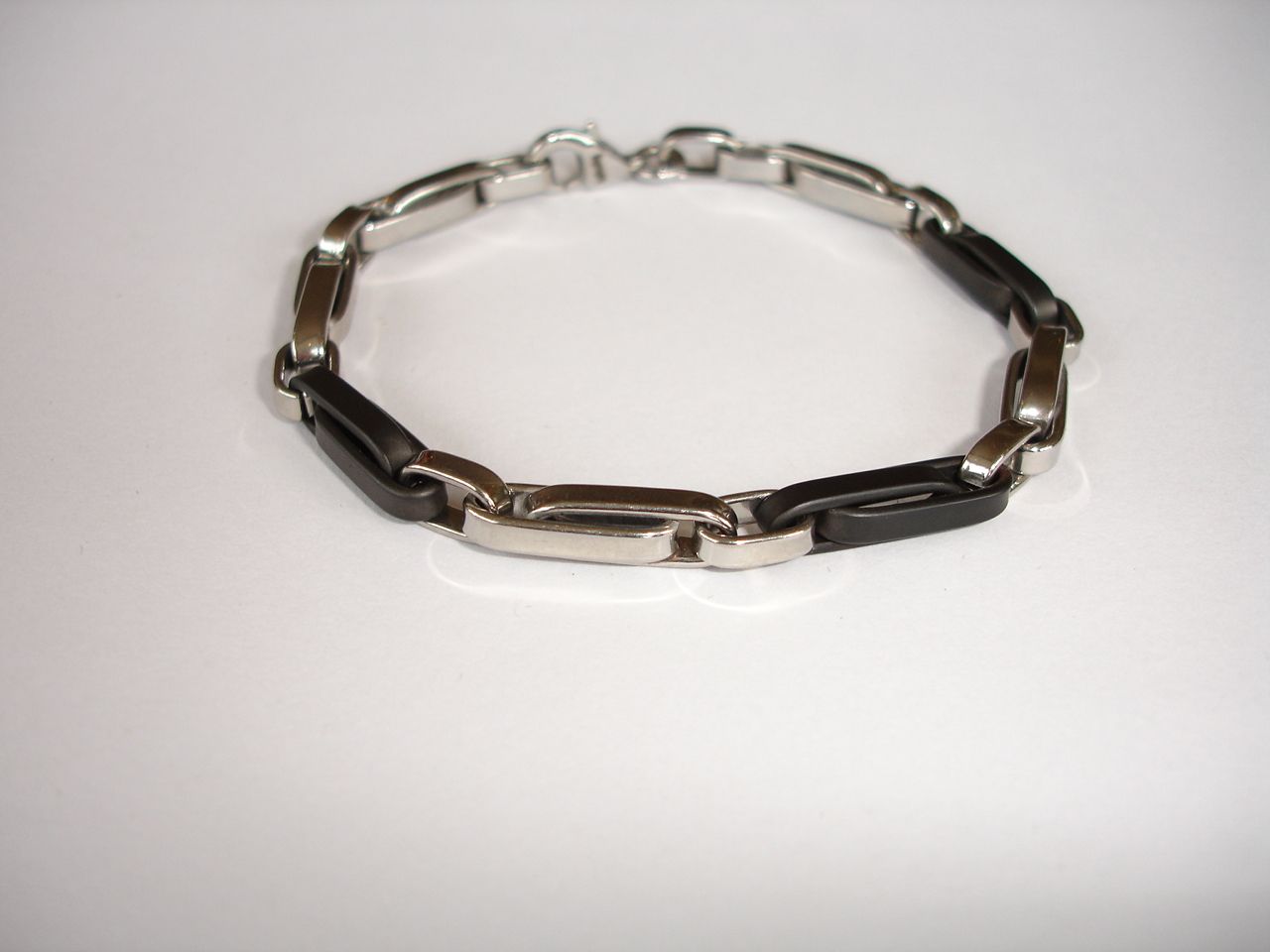 Náramok vyrobený z nerezovej ocele v nadčasovom bicolor spracovaní, dĺžka čánku 2 cm, s čiernym zdobením, má bezpečnostné zapínanie. Dĺžka náramku je 20 cm.