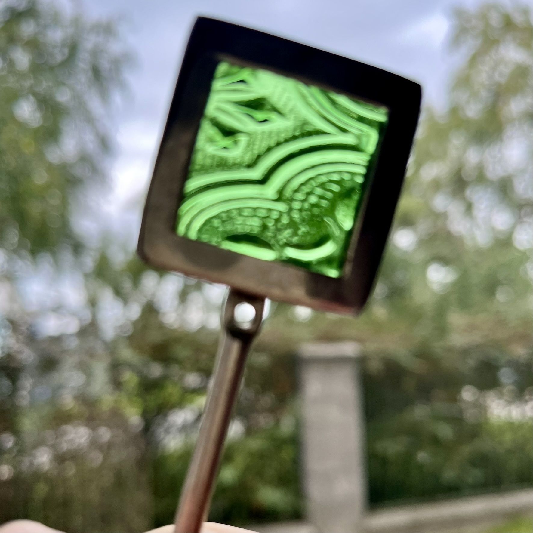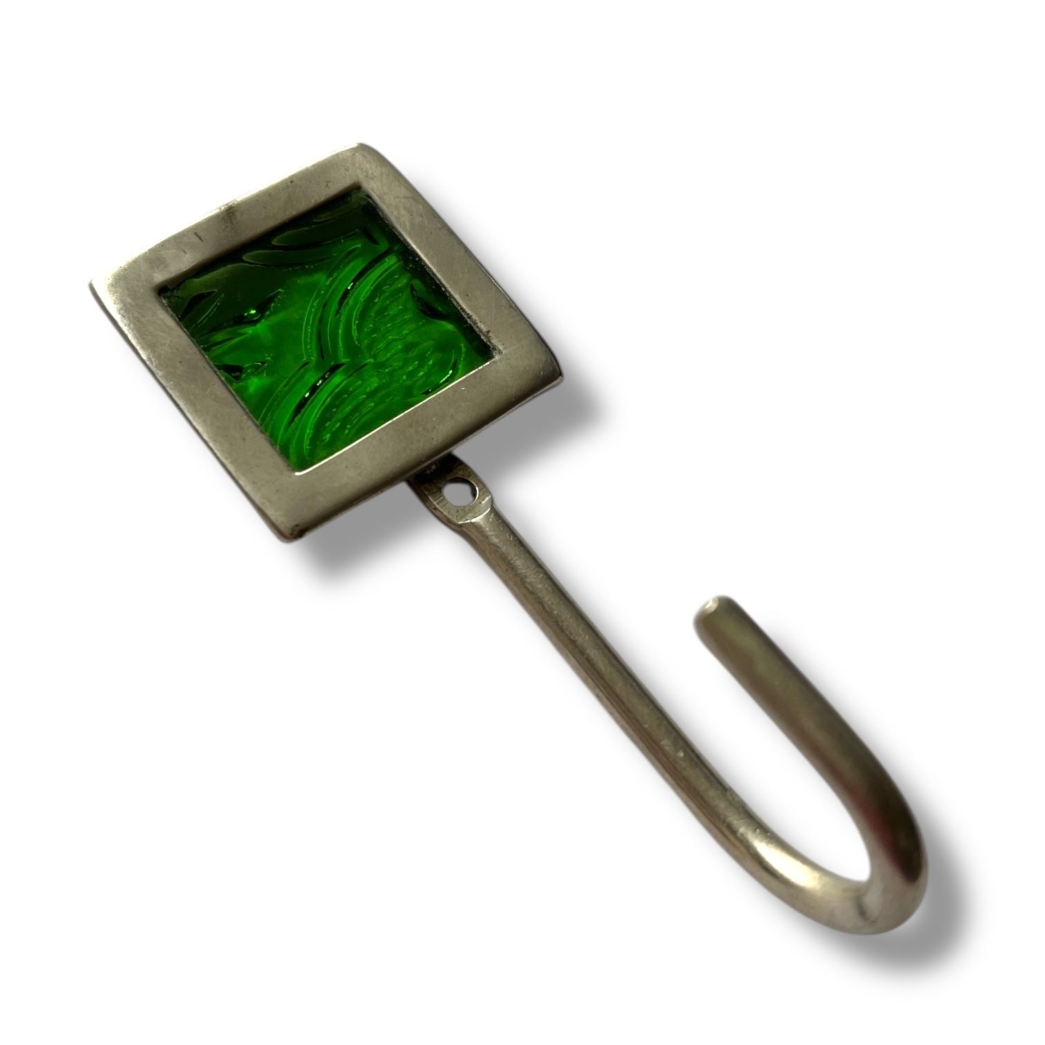 Vešiačik so sklenenou vitrážovou dekoráciou zelenej farby. Výška cca 8,5 cm
