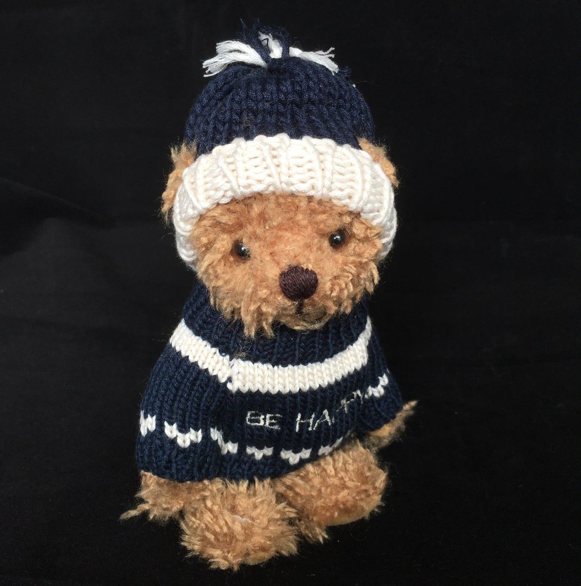 Macko v troch farbách v štrikovanom svetri s hviezdičkou alebo nápisom BE HAPPY.