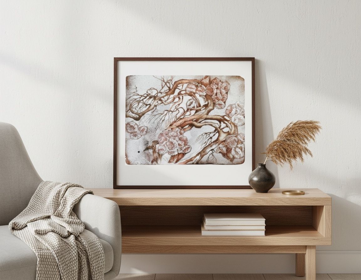 „Jarná impresia“ — nežná umelecká reprodukcia plná kvetov, ktorá vnukne vášmu interiéru pokoj a poetiku. Rozmer tlače: 50 × 65 cm, bez rámu. Grafika v harmónii hnedých, prírodných tónov s elegantným motívom, ktorý do priestoru vnesie kúsok prírody. Dielo vyniká svojou jemnosťou a precíznosťou spracovania. Pripravené na zarámovanie.