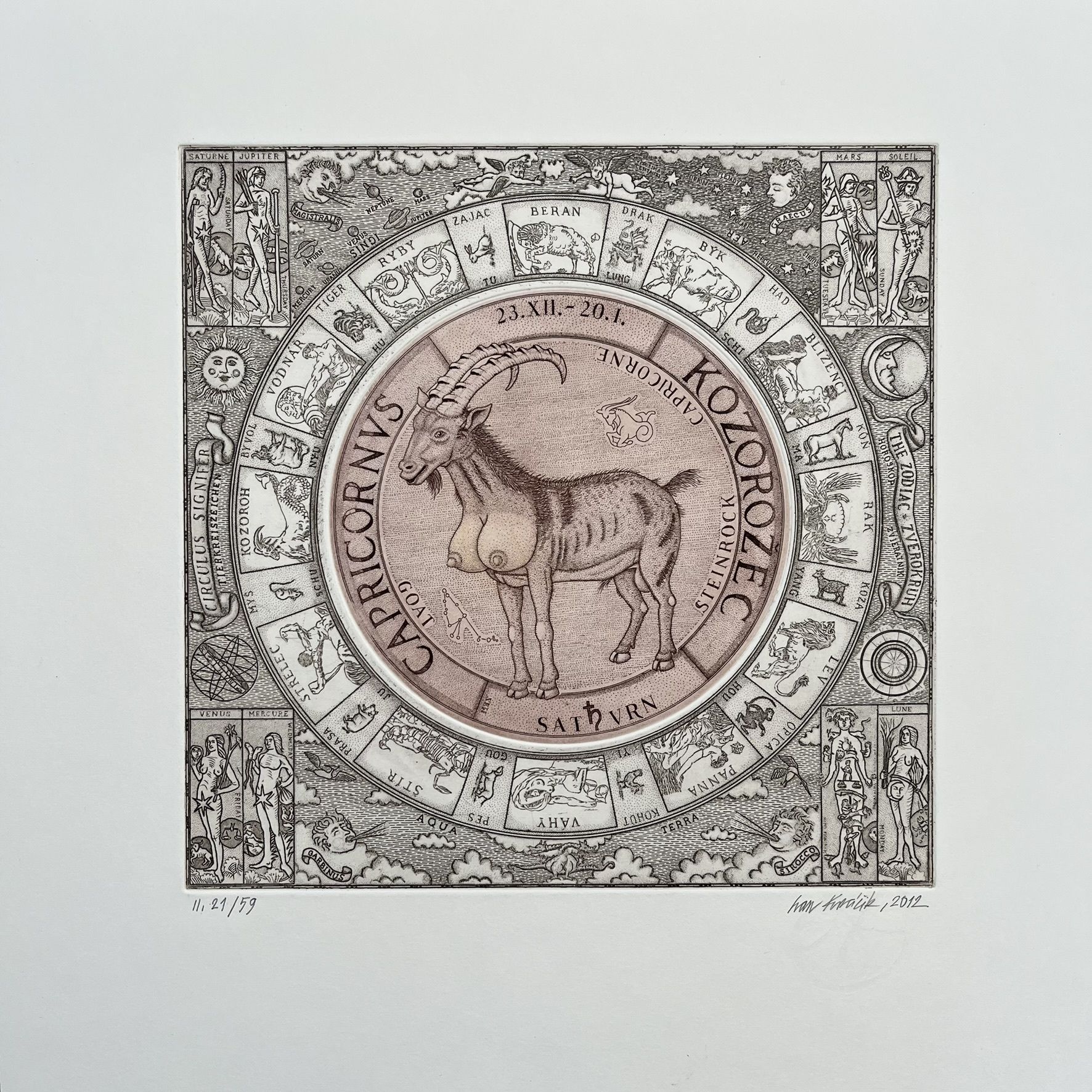 Znamenia zverokruhu možno poňať a znázorniť rôznymi spôsobmi. Toto ponúka Ivan Kováčik. Grafické listy - rozmer tlače 20x20 cm. Znamenie Kozorožec 22.12. - 20.1.