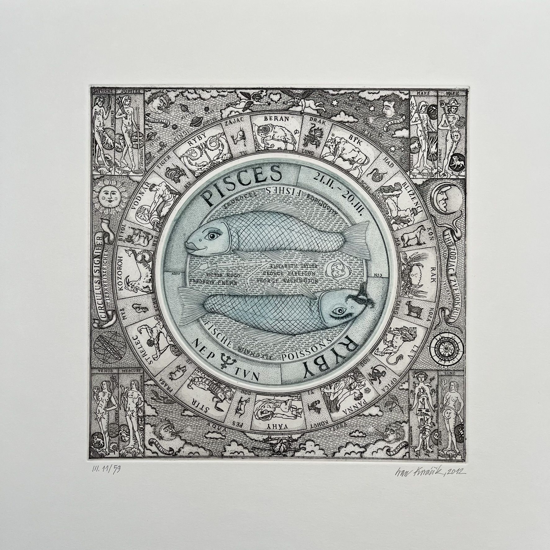 Znamenia zverokruhu možno poňať a znázorniť rôznymi spôsobmi. Toto ponúka Ivan Kováčik. Grafické listy - rozmer tlače 20x20 cm. Znamenie Ryby 20.2. - 20.3.