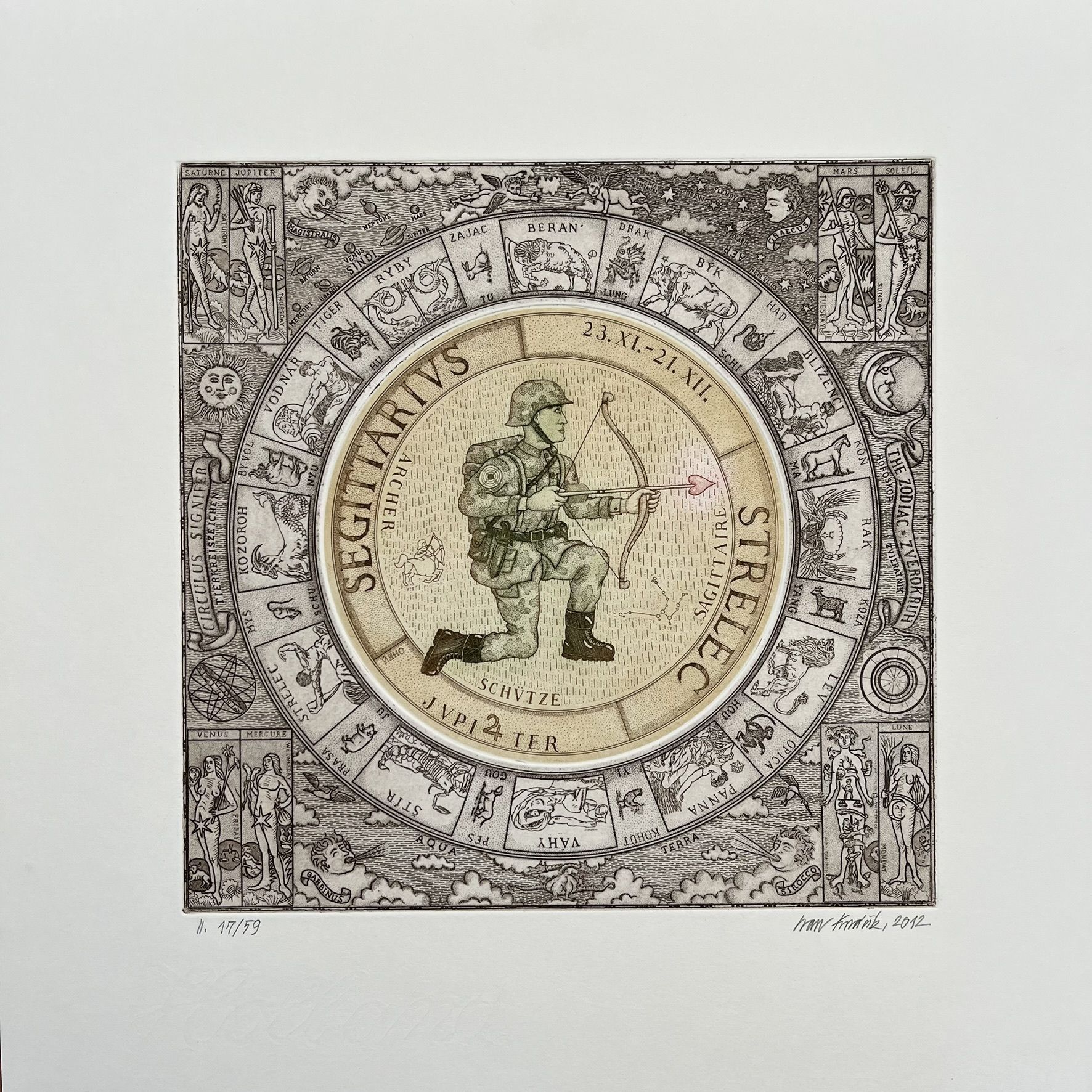 Znamenia zverokruhu možno poňať a znázorniť rôznymi spôsobmi. Toto ponúka Ivan Kováčik. Grafické listy - rozmer tlače 20x20 cm. Znamenie Strelec 23.1 - 21.12.