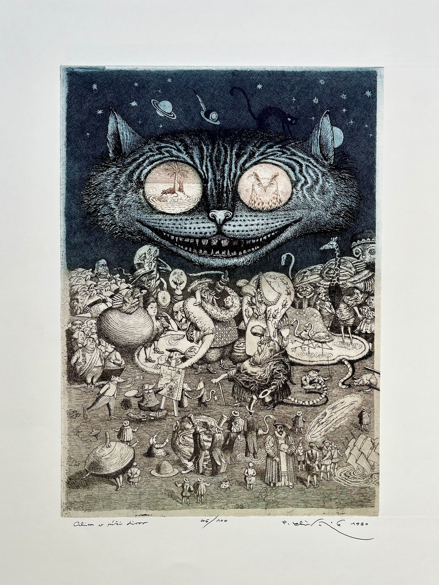 Grafický list, Alica v ríši divov, Mačka, 46/100. Nezarámovaný grafický list, rozmer tlače 46 x 32 cm.