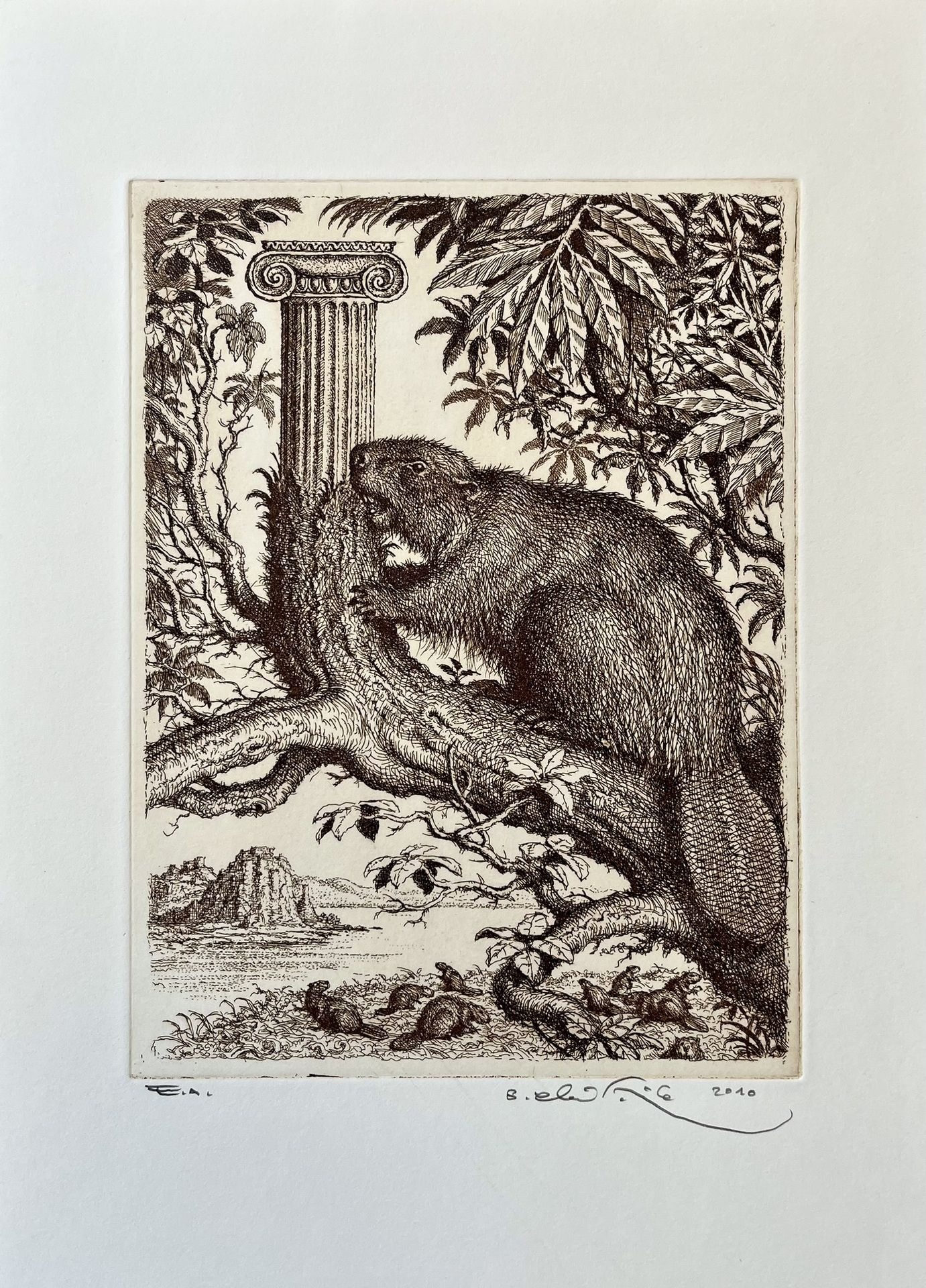 Grafický list od Petra Kľúčika, Bobor. Nezarámované, rozmer tlače 20 x 15 cm.