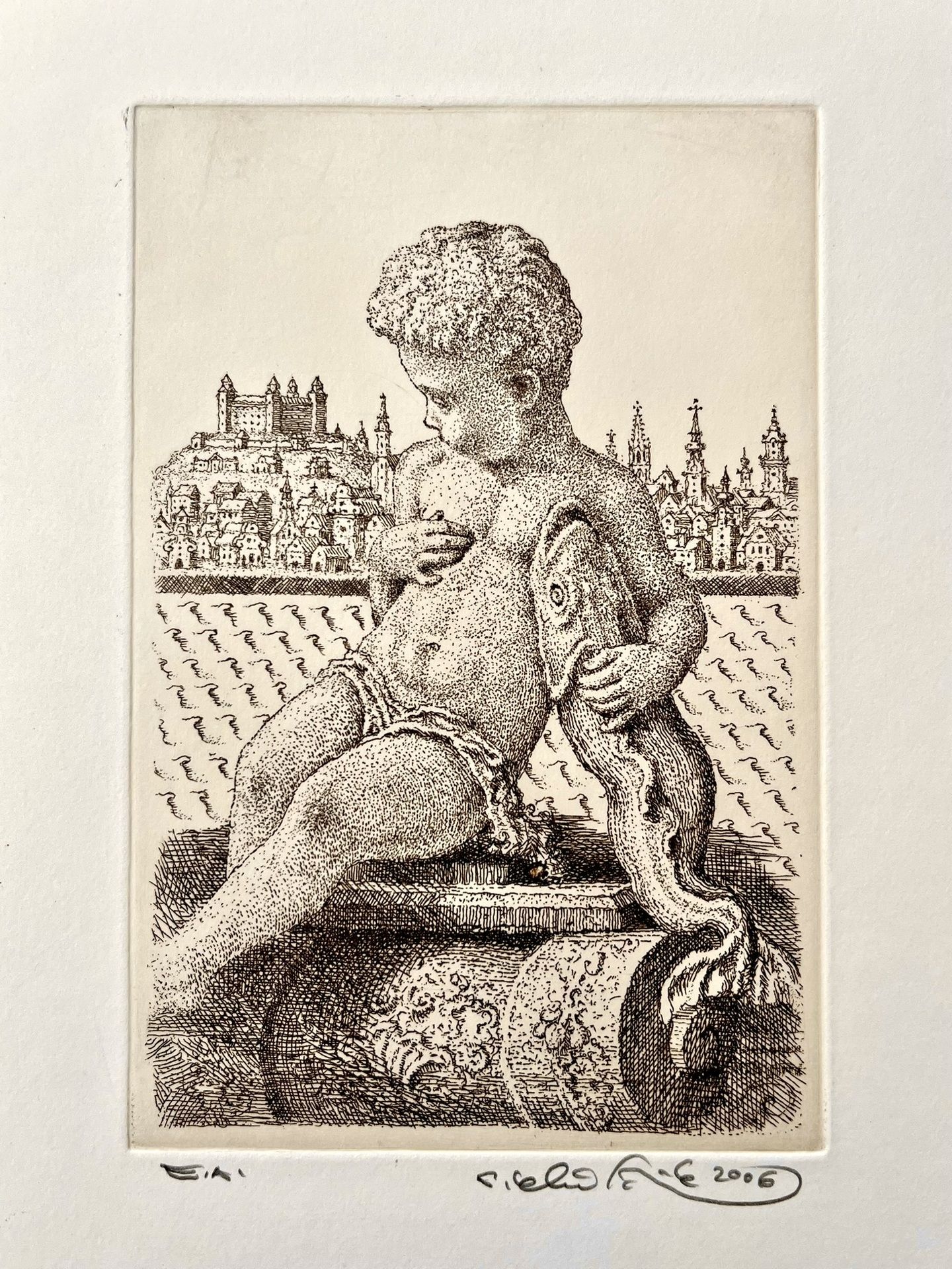 Grafický list od Petra Kľúčika, Chlapec s rybou, BA. Nezarámované, rozmer tlače 15 x 10 cm.