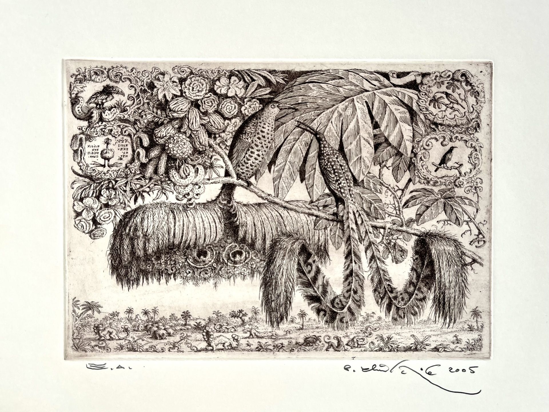 Grafický list nezarámovaný Dva vtáky s veľkými chvostami, rozmer 16 x 23 cm.
