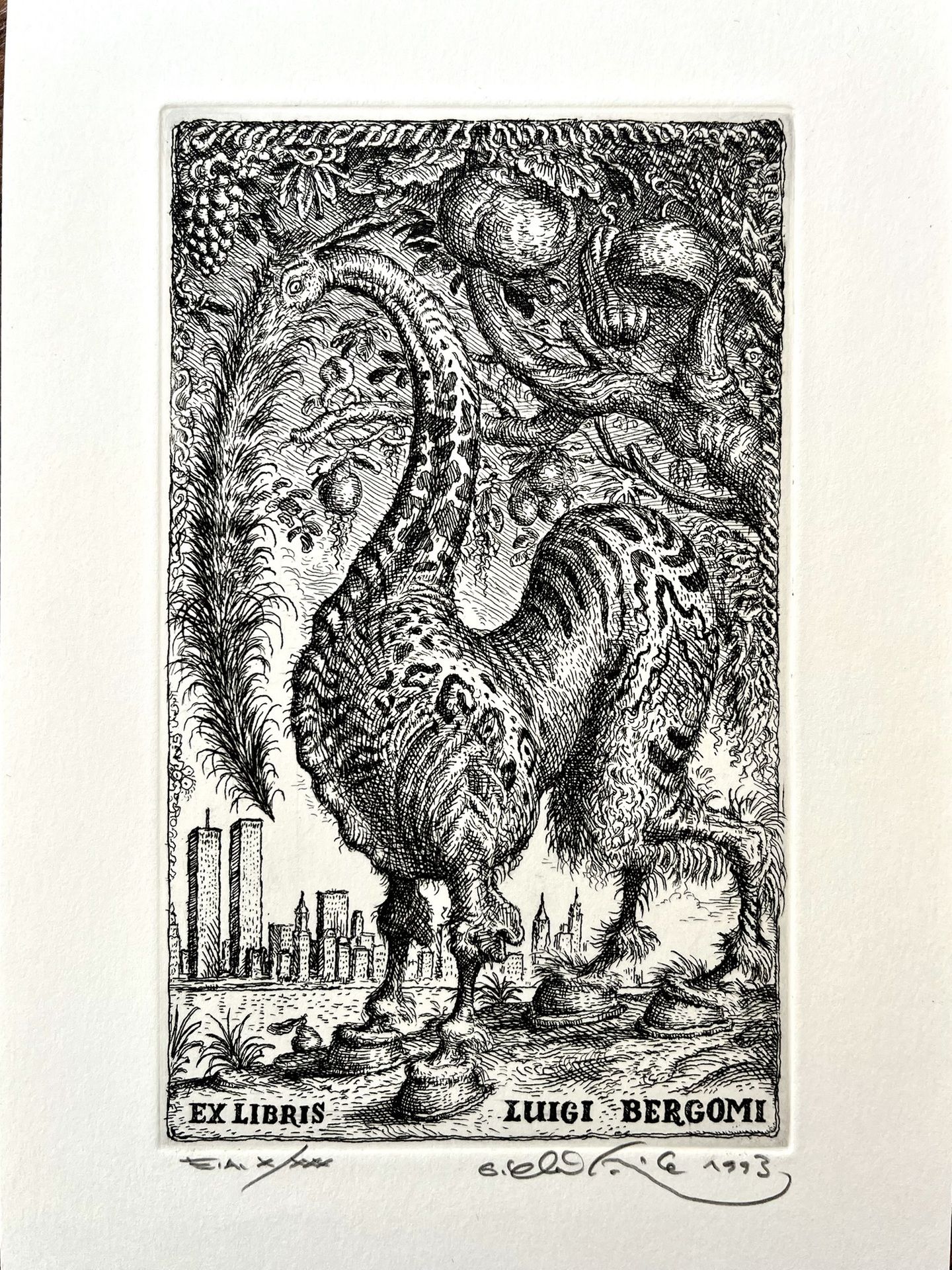 Grafický list od Petra Kľúčika, EX LIBRIS LUIGI BERGOMI. Nezarámované, rozmer tlače 15 x 10 cm.