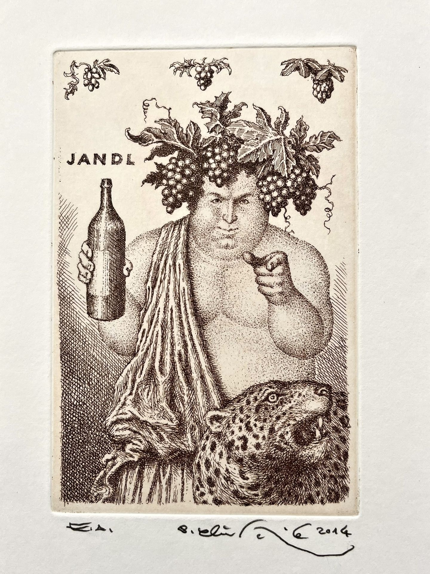 Grafický list, Bakchus s fľašou vína a gepardom, rozmer tlače 15x10 cm.