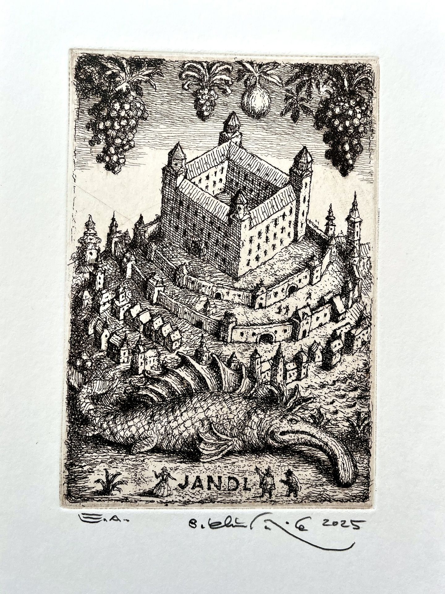 Zarámovaný grafický list od Petra Kľúčika, Bratislavský hrad s krokodílom, 2025. Rozmer tlače 15 x 10 cm.
