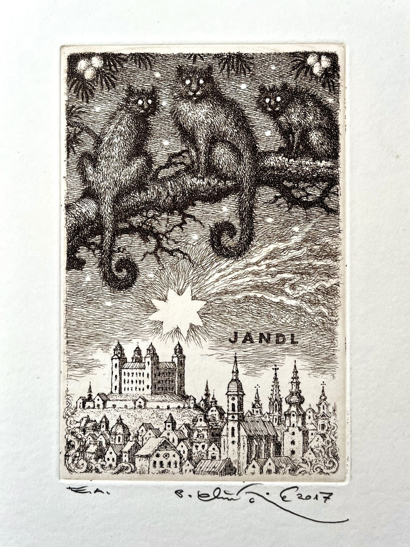 Grafický list, Tri potvory nad Bratislavou, rozmer tlače 15x10 cm.