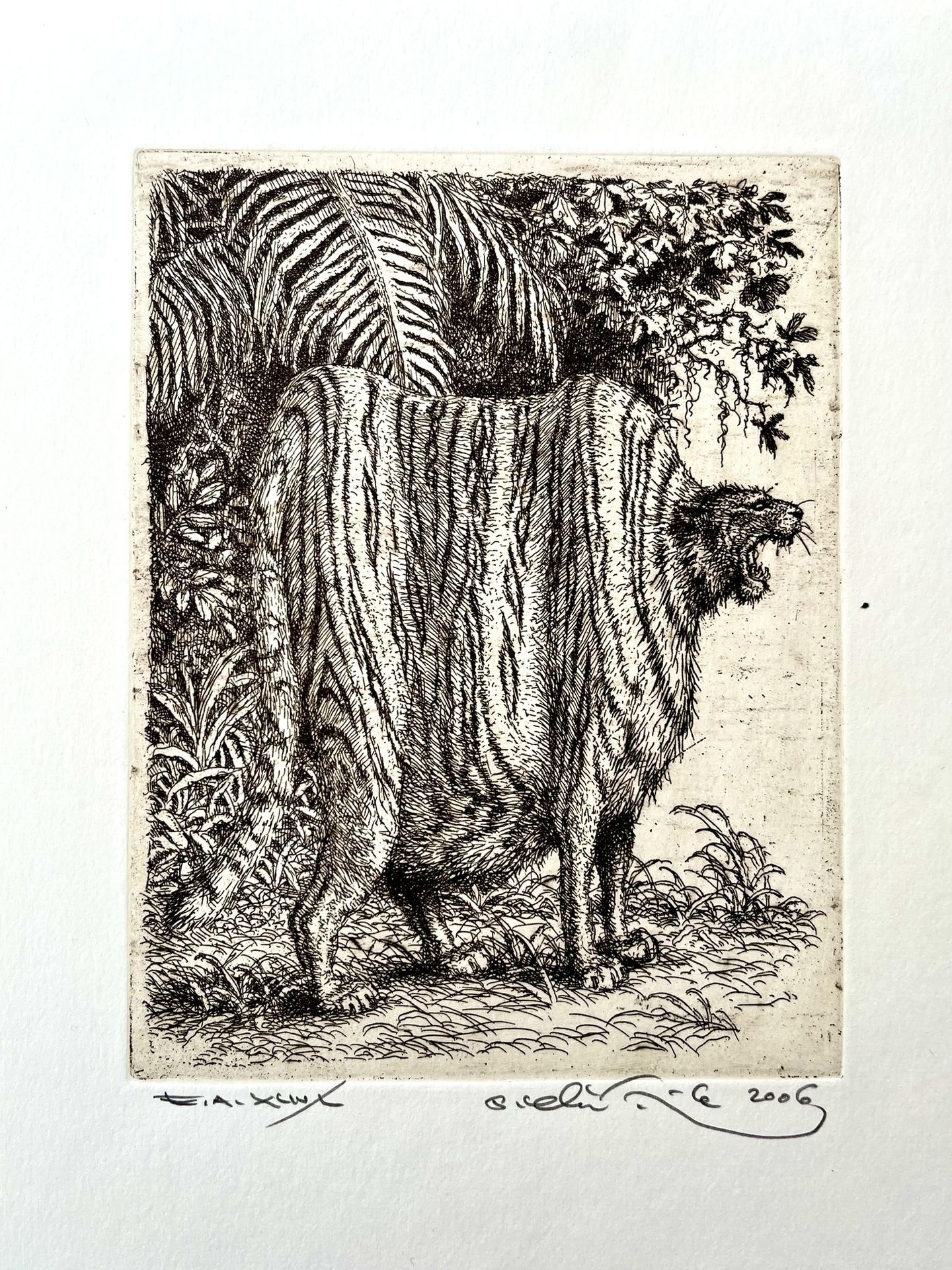 Grafický list od Petra Kľúčika, Tučný tiger. Nezarámované, rozmer tlače 15 x 10 cm.