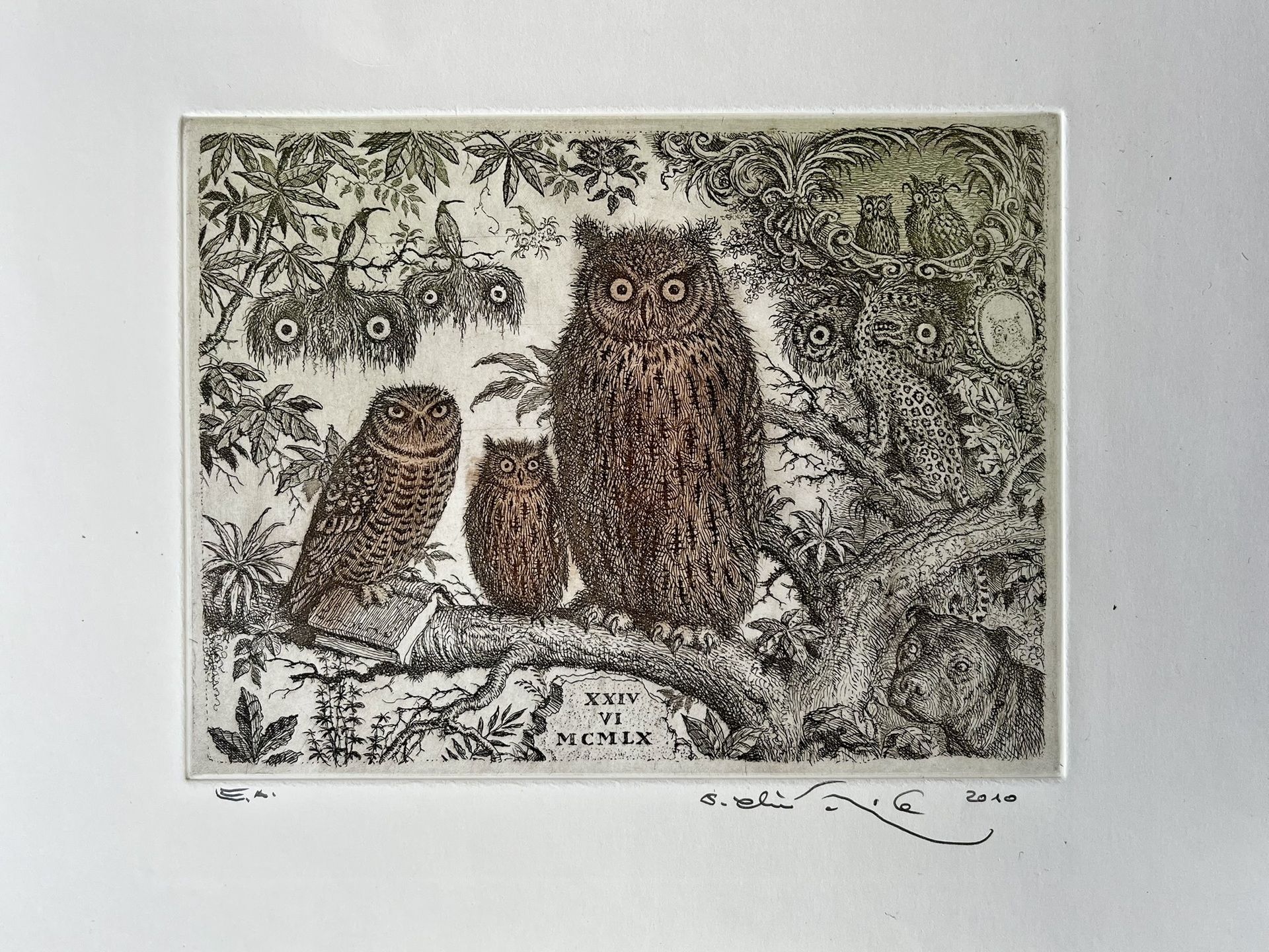 Grafický list od Petra Kľúčika, Sovičky. Rozmer tlače 15x20 cm, v svetlo-hnedom rámiku 23x32 cm..