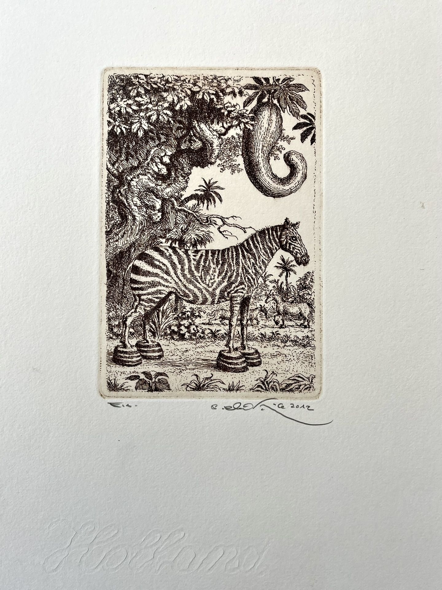 Grafický list od Petra Kľúčika, Zebra. Nezarámované, rozmer tlače 15 x 10 cm.