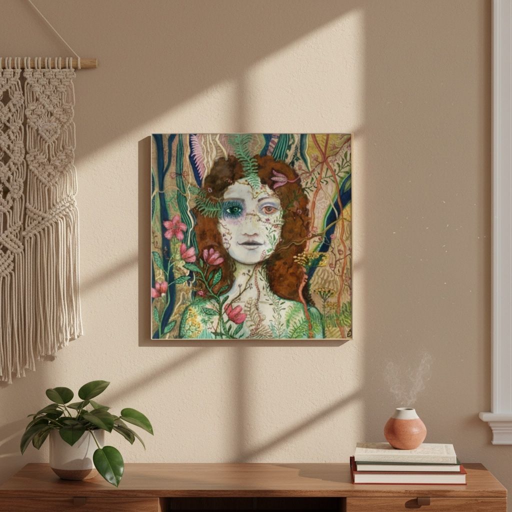 Originálna maľba akrylom na plátne, 50 × 50 cm — živé farby a jemná textúra, ktorá oživí interér. Tento jedinečný kus vyniká svojim štýlom a paletou príjemných prírodných tónov. Dielo vyžaruje harmonickú atmosféru pokoja, ktorú predstavuje portrét dievčaťa so zasneným, pokojným výrazom. Maľba je zaplnená kvetmi a vyniká v interéri.