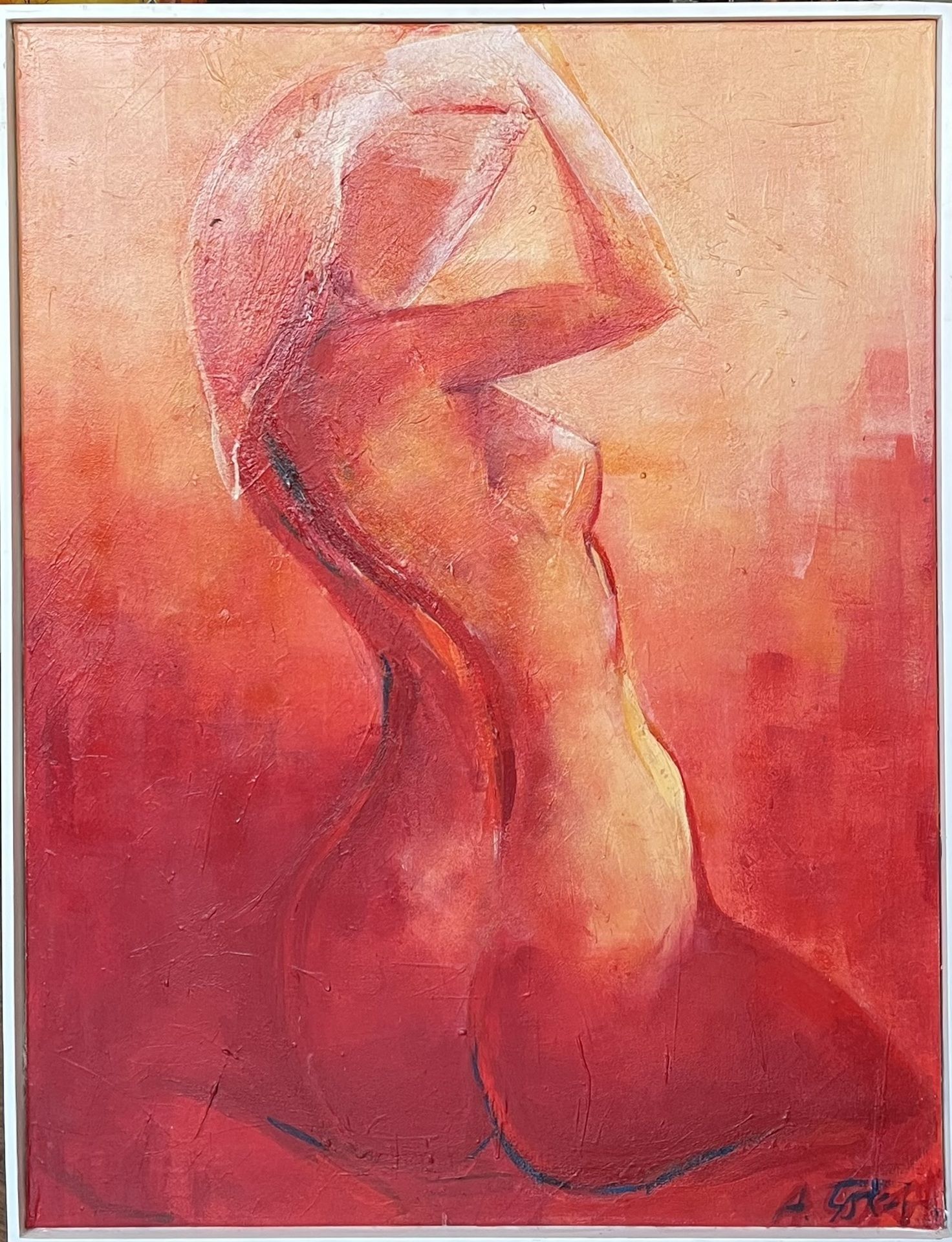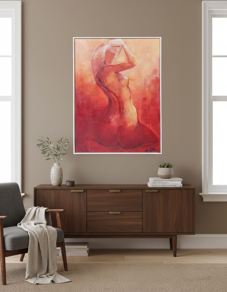 Akt — olejomaľba na plátne, 105 × 78 cm. Originálne autorské dielo s výraznou hrou svetla, farby a textúry, ktoré sa stane pôsobivým centrom interiéru alebo cenným prírastkom do zbierky. Každý ťah štetca je jedinečný a prináša hmatateľnú plastiku povrchu. Centrom maľby je abstraktná postava ženy vo vášnivých odtieňoch červenej a oranžovej, ktorá sa otáča smerom k divákovi.