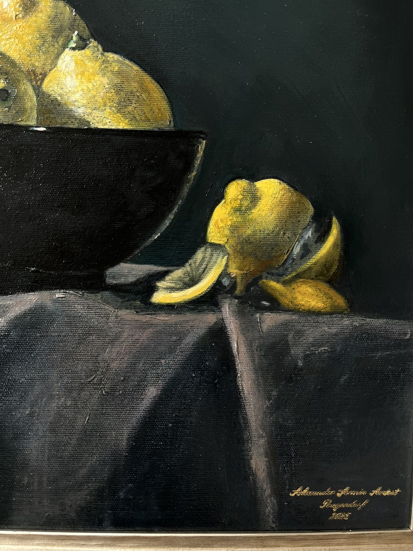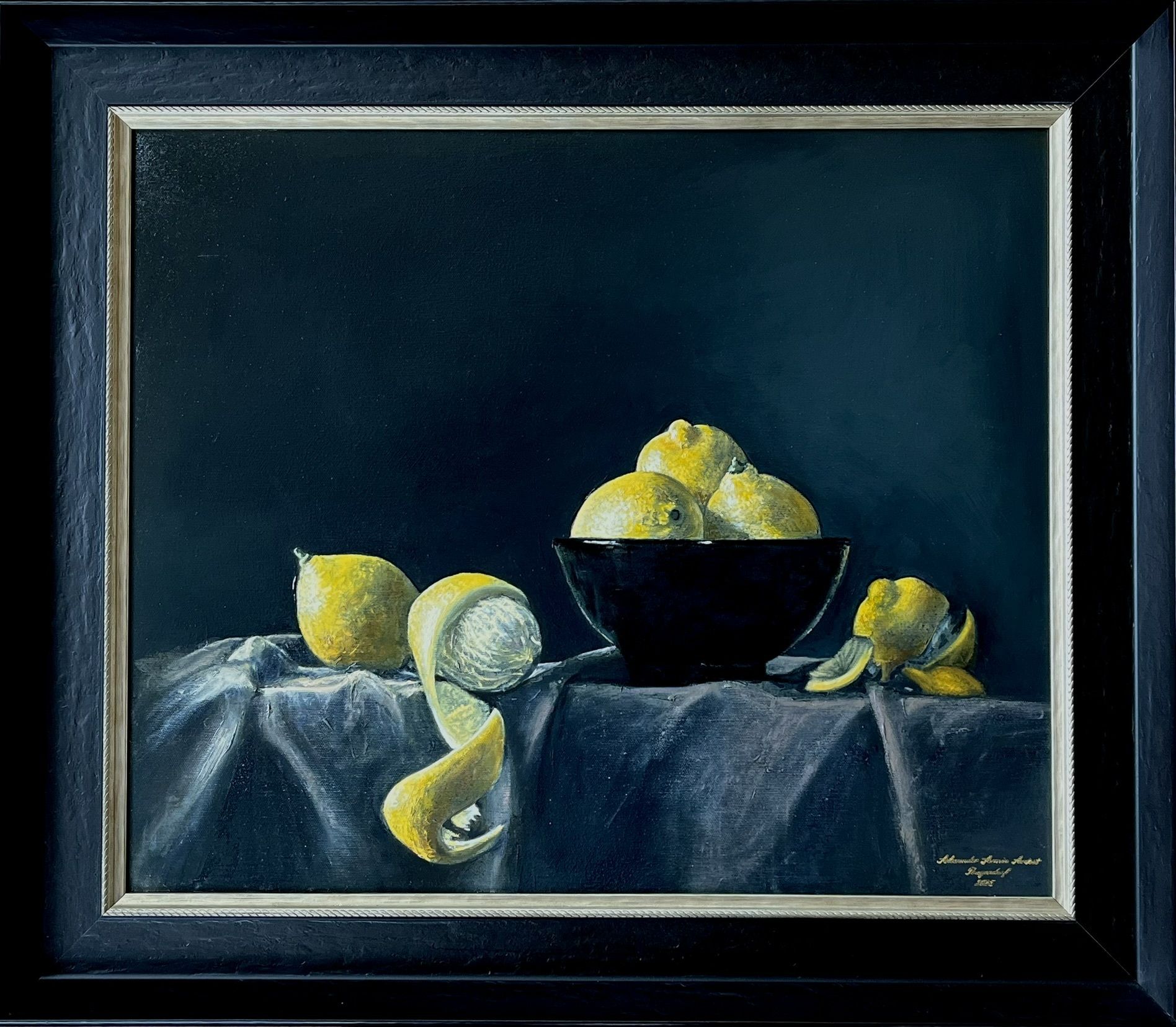 Olejomaľba na plátne, Rozmer 49x59 cm, zarámované 64x74. Aj citróny v tmavej miske môžu byť umeckým dielom. Tmavé pozadie, o niečo svetlejší obrus v elegantnom tmavom ráme vkusne oživý moderne zariadený interiér.