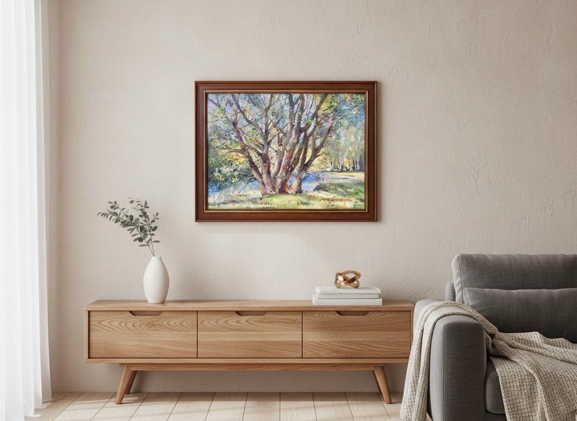 Strom pri rieke - originálna olejomaľba od Ester Ksenzsigh – nežná, emotívna kompozícia zarámovaná vo vkusnom drevenom ráme. Rozmery: 30 × 40 cm + rám 4 cm, pripravená na zavesenie a okamžité vystavenie v domácnosti aj kancelárii. Výborný darček pre milovníkov umenia alebo štýlový doplnok do moderného interiéru.
