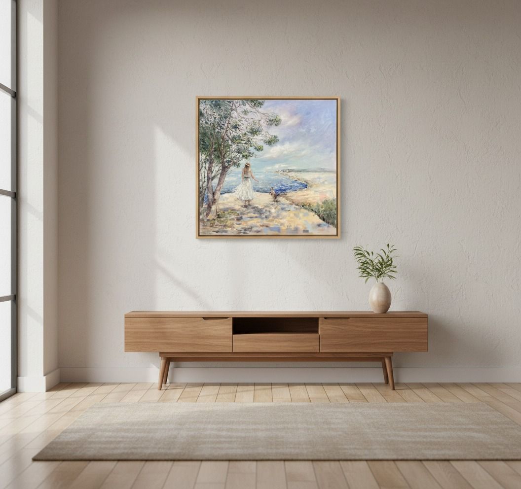 Vyhliadka pri mori - romantický akrylový obraz na plátne (nezarámovaný), s rozmermi 70 × 70 cm.