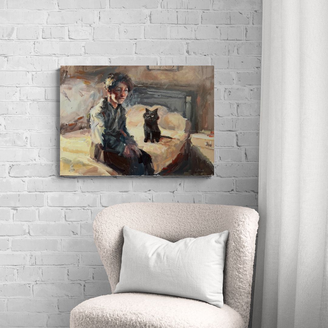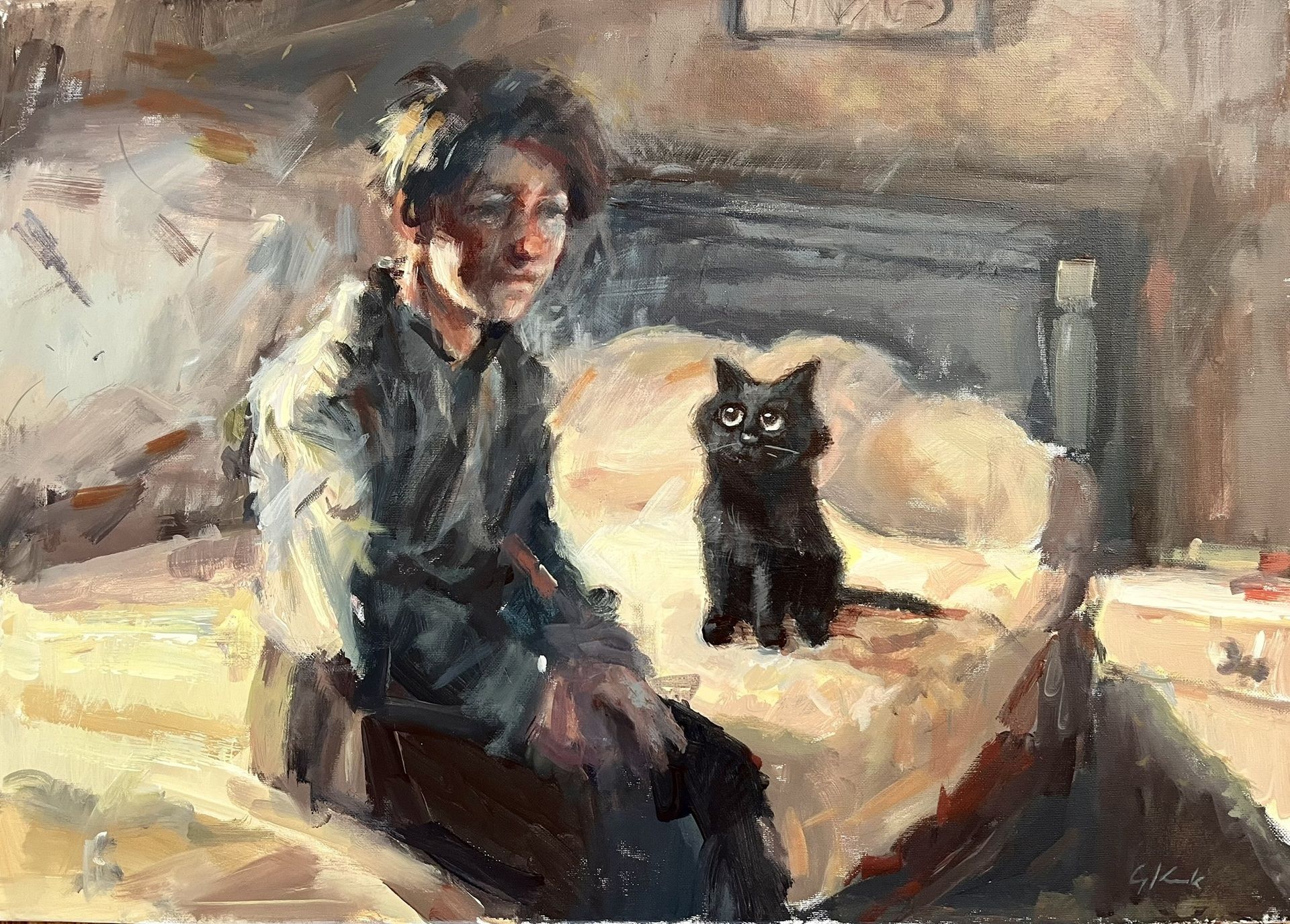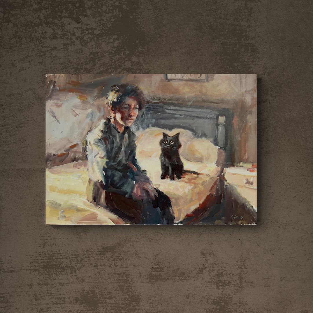 Olejomaľba na plátne zobrazuje smutného/zamysleného chlapca s čiernym kocúrom. Rozmer diela je 50 x 70 cm, nezarámované .