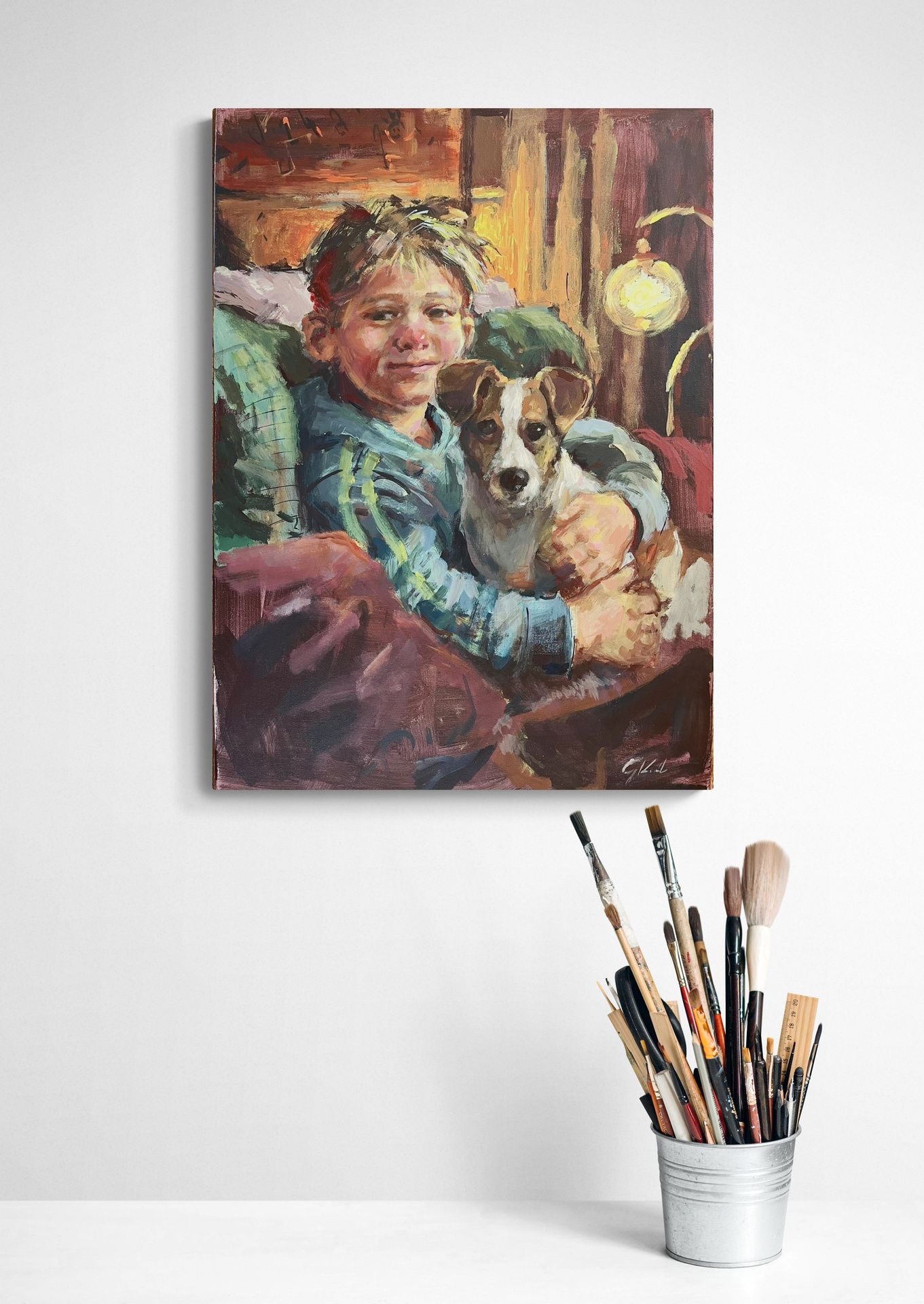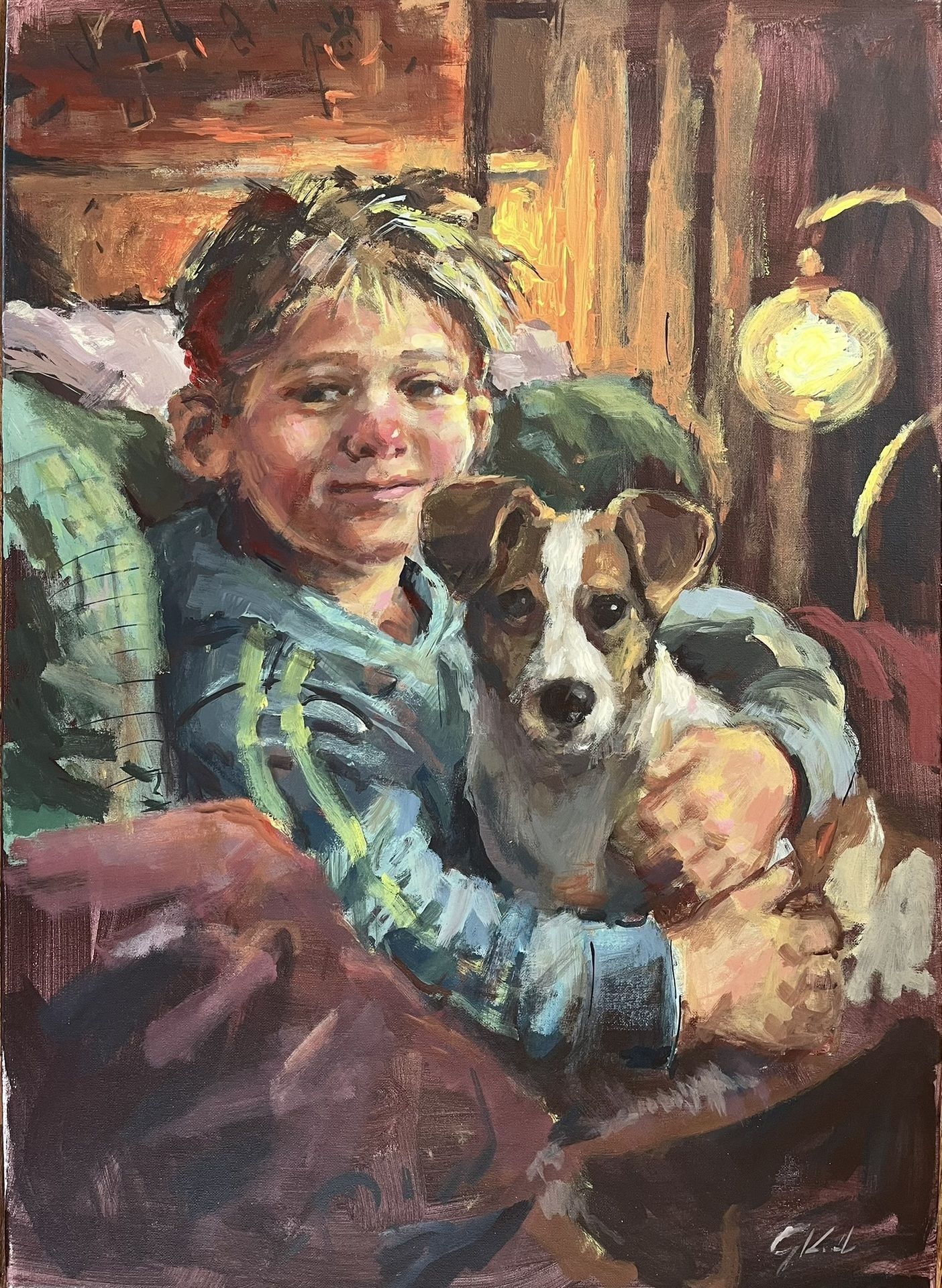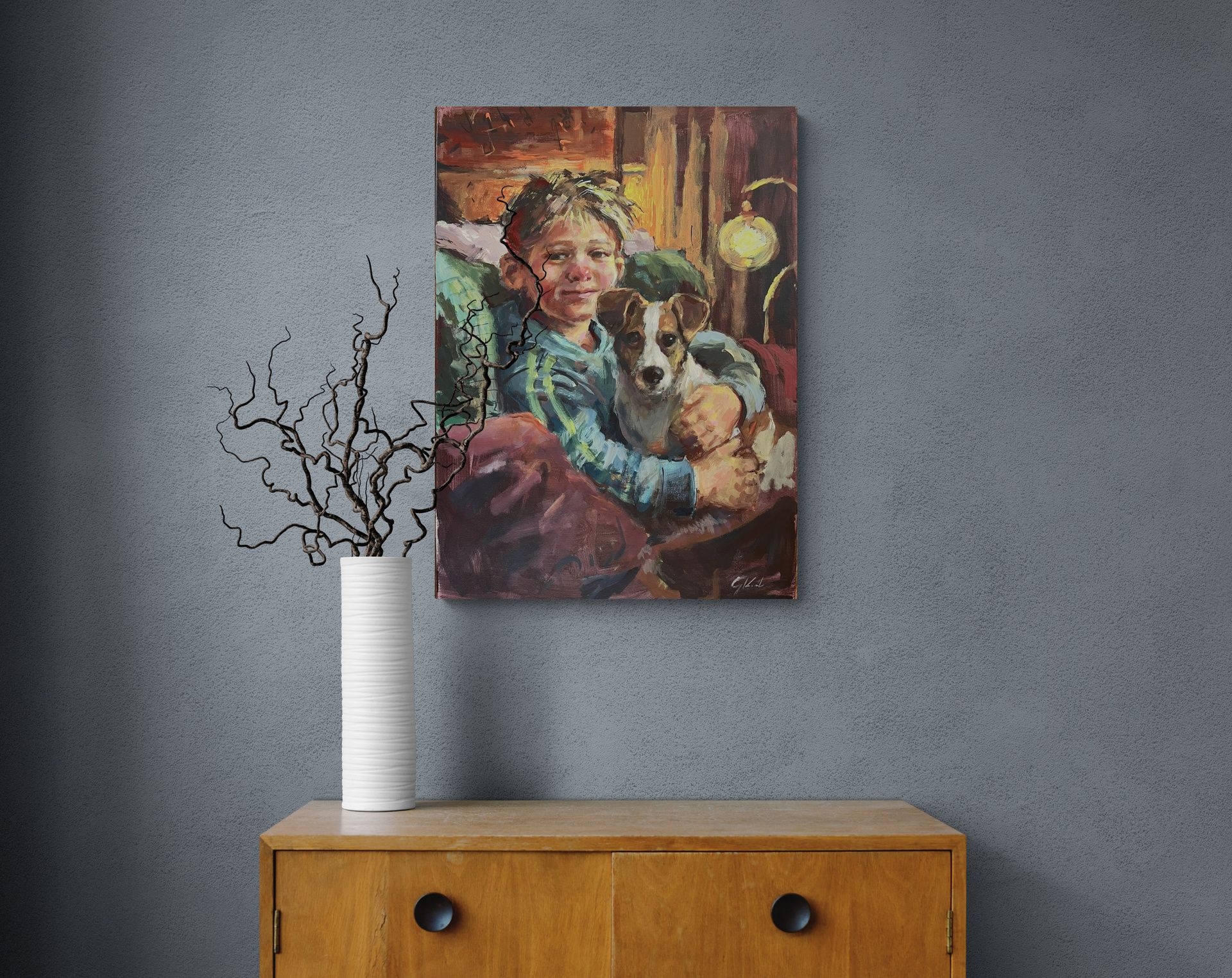 Olejomaľba na plátne, Chlapec so psíkom. Rozmer diela je 50 x 70 cm, nezarámované .