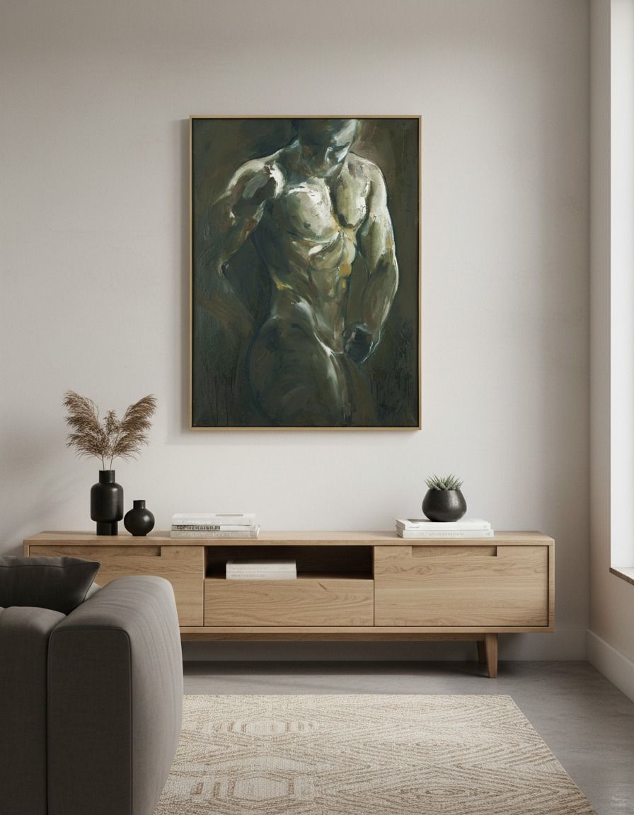Olejomaľba na plátne – Akt: mužská postava, rozmery 100 x 75 cm. Autorský originál vytvorený svojráznou technikou olejových farieb, kde dôraz na modeláciu a svetlo podčiarkuje plastiku tela a dynamiku pózy. Elegantné a pôsobivé dielo vhodné do moderného interiéru, pracovnej kancelárie alebo súkromnej zbierky.