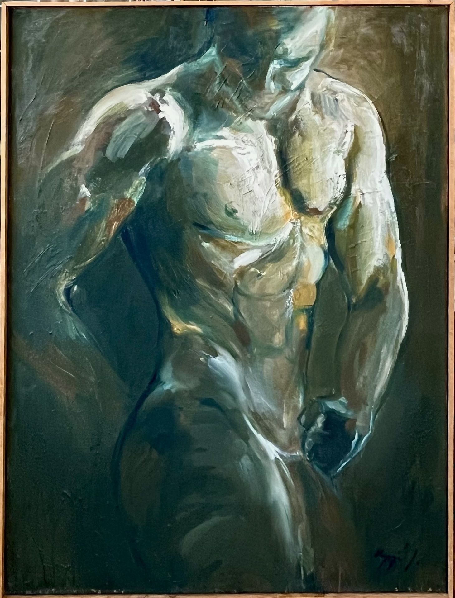 Olejomaľba na plátne – Akt: mužská postava, rozmery 100 x 75 cm. Autorský originál vytvorený svojráznou technikou olejových farieb, kde dôraz na modeláciu a svetlo podčiarkuje plastiku tela a dynamiku pózy. Akt s výraznou hrou svetla a tieňa, farby a textúry. Každý ťah štetca je jedinečný a prináša hmatateľnú plastiku povrchu. Elegantné a pôsobivé dielo vhodné do moderného interiéru alebo súkromnej zbierky.