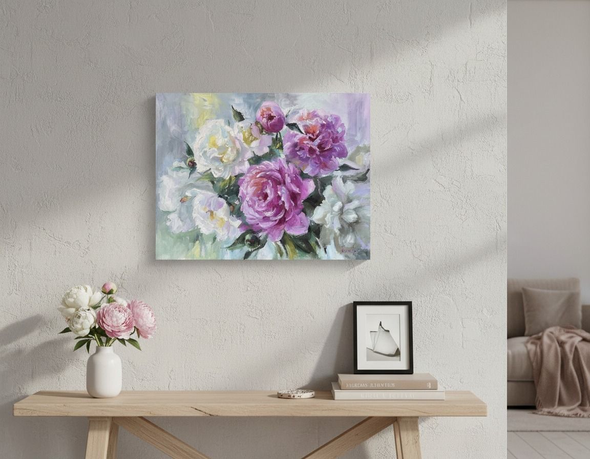 Olejomaľba na plátne — nežné biele a ružové pivonky. Rozmer 40 × 50 cm. Originálny obraz s jemným vyjadrením kvetov, ktorý dodá interiéru útulnú a elegantnú atmosféru; ideálny do obývačky, spálne alebo ako darček pre milovníka výtvarného umenia.
