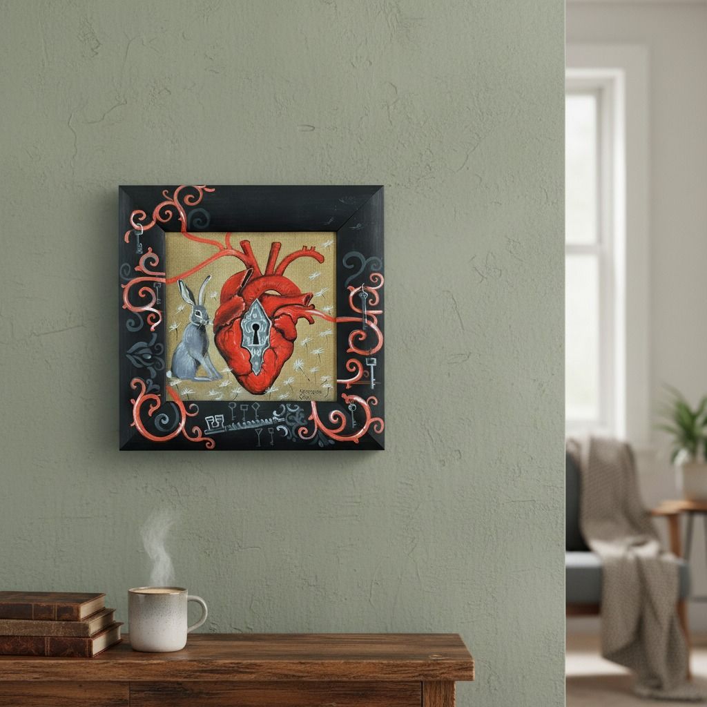 Zajačik čaká na lásku svojho srdca — originálna akrylová maľba 20 × 20 cm v elegantnom čiernom ráme, rozmery s rámom sú 30 × 30 cm. Malý formát s milým motívom evokuje atmosféru pokoja a mierumilovnosti. Emotívny, nežný motív, ktorý prinesie do interiéru osobný charakter a je ideálny ako originálny dar alebo štýlový doplnok domova.