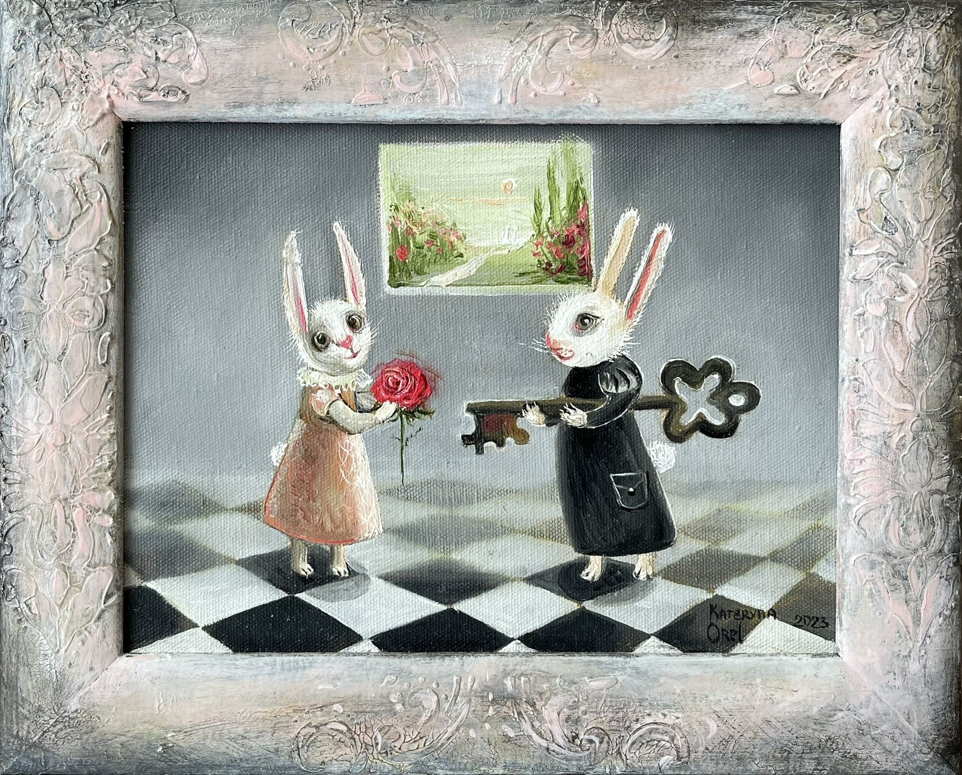 Olejomaľba na plátne, Láska dvoch zajkov. Rozmer plátna 18x24 cm, zarámované originálnym rámom 25x31 cm.
