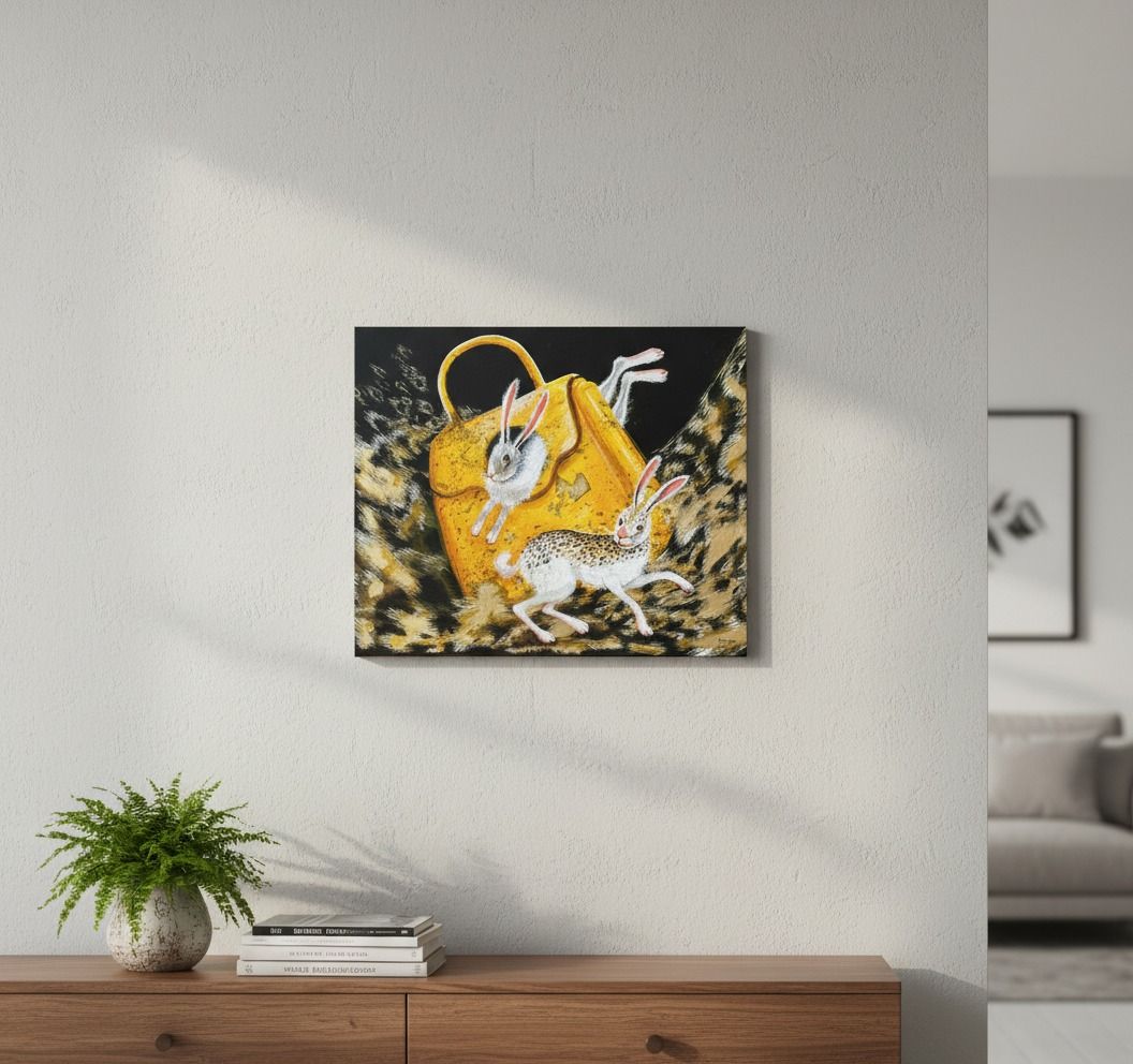 Žiarivá akrylová maľba „Žltá kabelka a dva zajace“ s jemnými zlatými listami — obraz, ktorý pôsobí tak trochu kúzelne, akoby patril do sveta ilúzií. Autorka využíva kontrast medzi tmavým pozadím a výraznými tónmi žltej. Akrylové farby na plátne, drobné zlaté detaily dodávajú dielu hĺbku a lesk. Rozmer 40 × 50 cm, nezarámované.