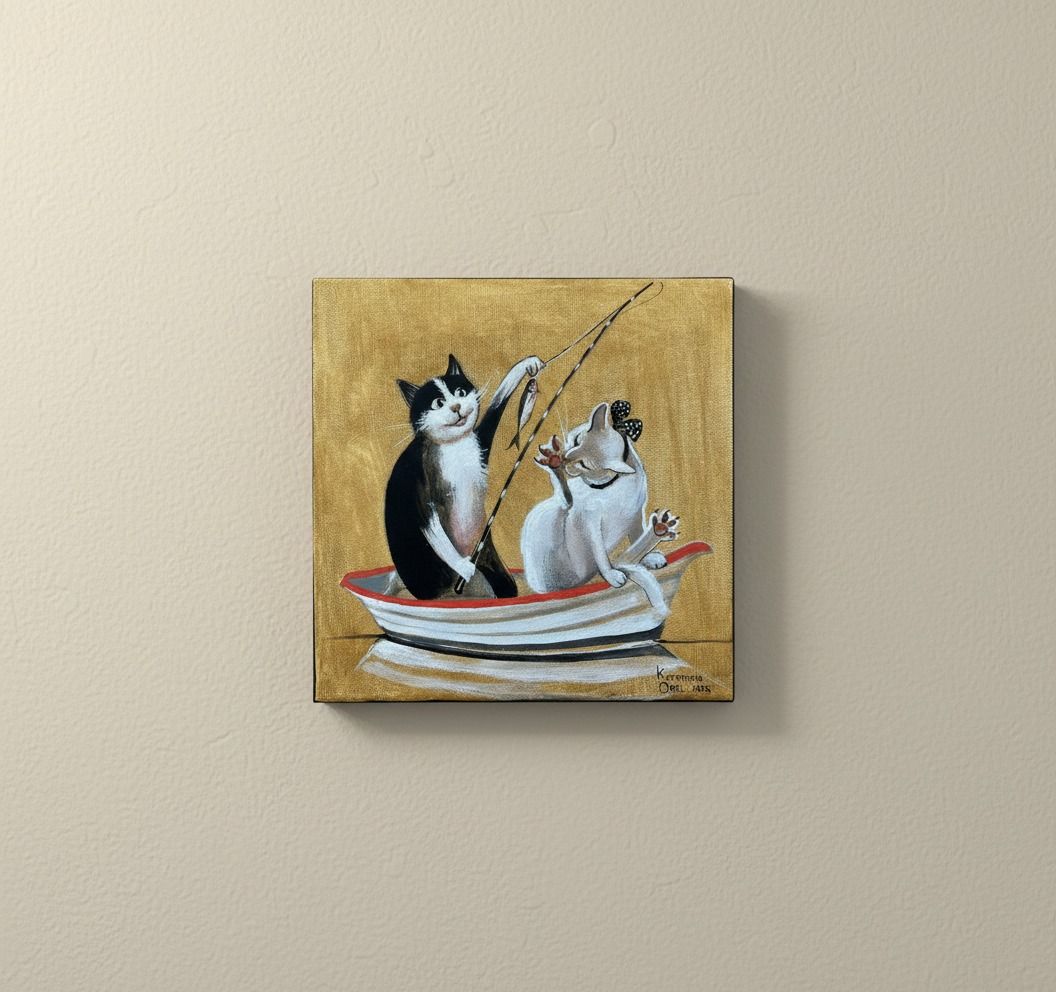 Aj takto možno vyznať lásku — kocúrik chytil mačičke chutnú rybičku. Akrylová maľba na plátne, 25 × 25 cm, originál, nezarámované. Emotívny a romantický motív, ktorý je elegantne doplnený zlatým pozadím, ktoré zažiari. Obrázok s nežným a hravým námetom určite poteší a prinesie atmosféru pokoja a mierumilovnosti. Vhodné ako milý a originálny darček pre milovníkov mačiek alebo ako osobitý doplnok do domácnosti.
