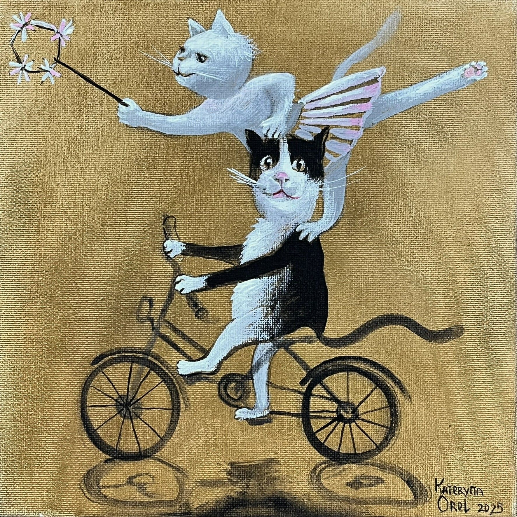 Dokonalá súhra, mačička s kocúrikom a ich akrobatické vystúpenie na bicylki, maľba akrylom na plátne 20x20 cm, nezarámované.