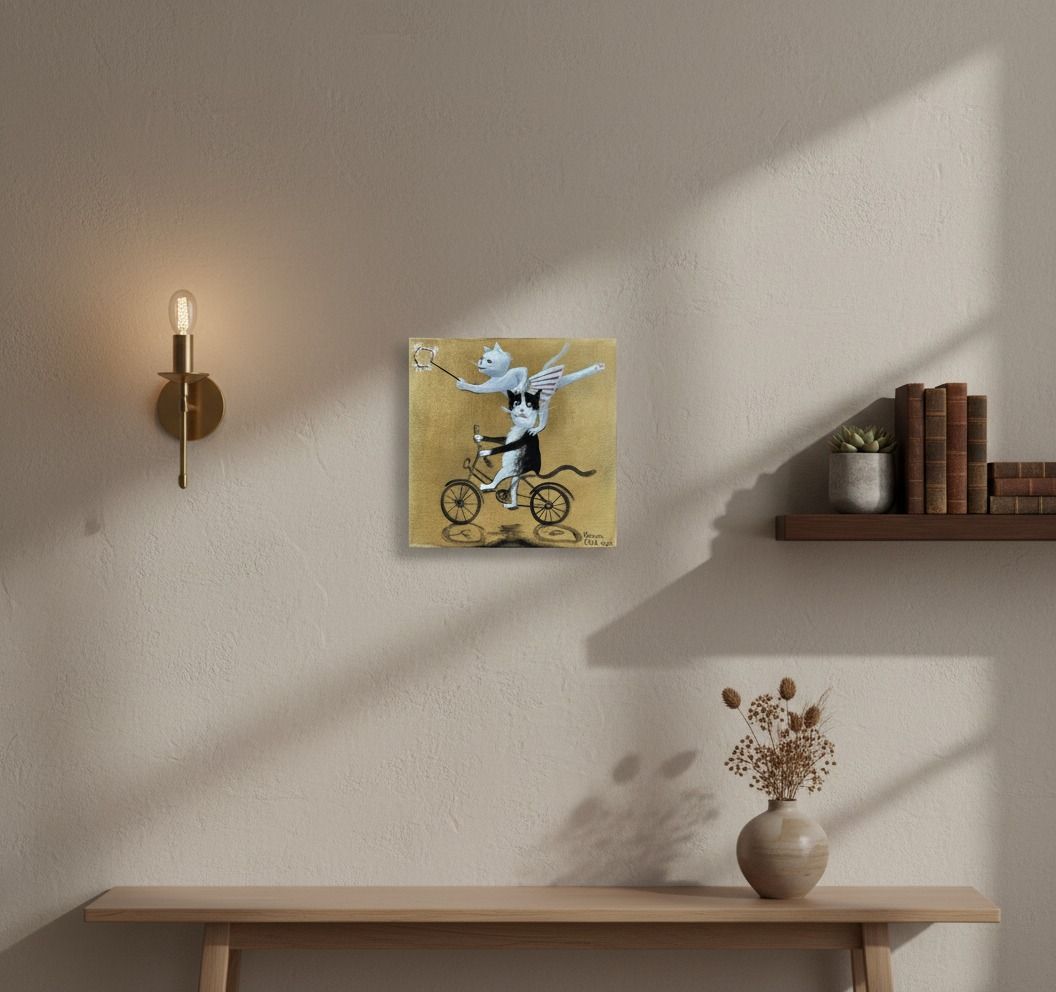 Okúzľujúca, hravá kompozícia: mačička a kocúrik v akrobatickom vystúpení na bicykli. Originálna akrylová maľba na plátne 20 × 20 cm, nezarámované — ideálne ako jedinečný darček alebo výrazný detail do menšieho priestoru. Postavy mačičiek pekne vynikajú na elegantnom zlatom pozadí. Obrázok s nežným a hravým námetom určite poteší a prinesie atmosféru pokoja a mierumilovnosti.
