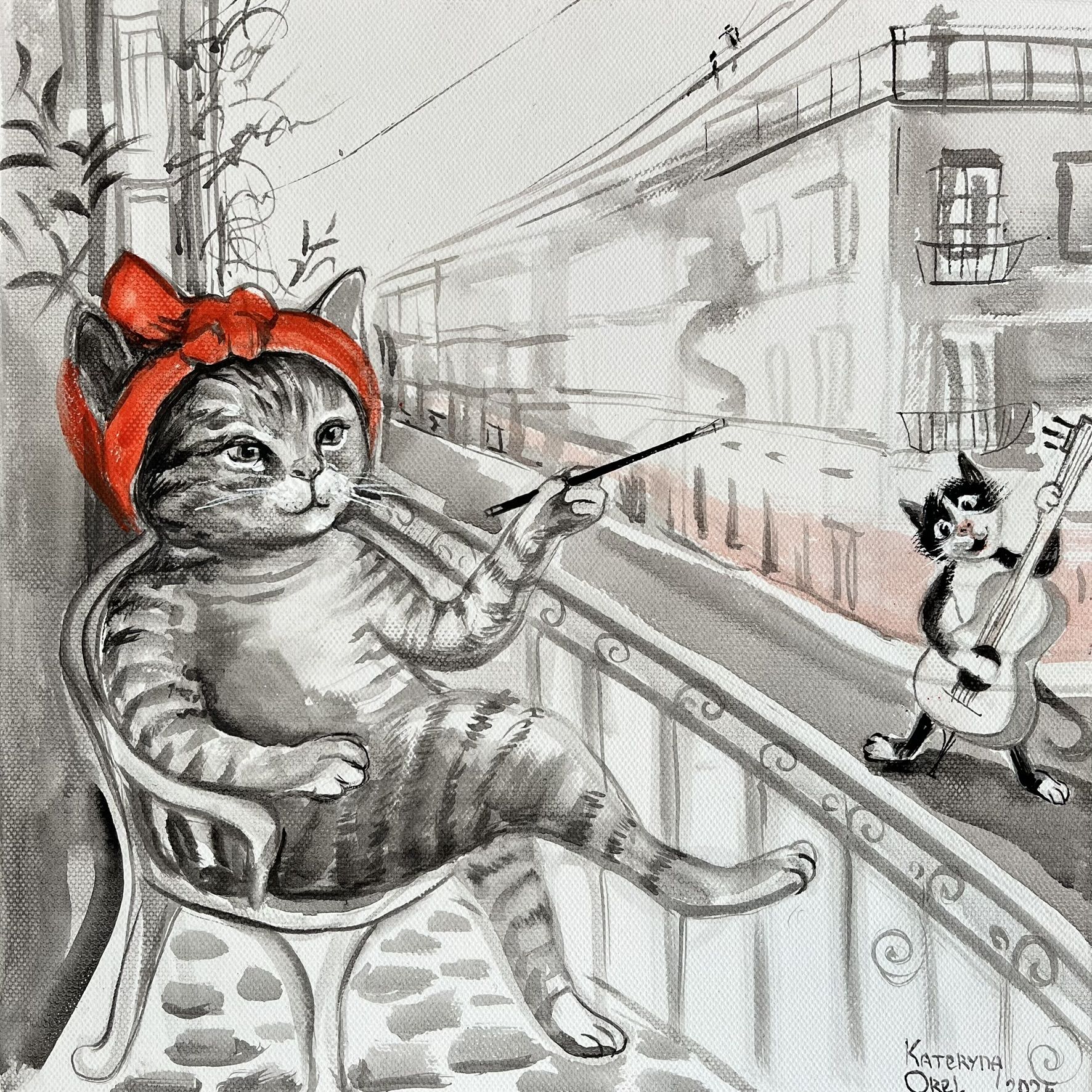 Maľba akrylom, Serenáda. Mačička s červeným šálom na hlave počúva na balkóne hru na kontrabase. Rozmer 30x30 cm, nezarámované.