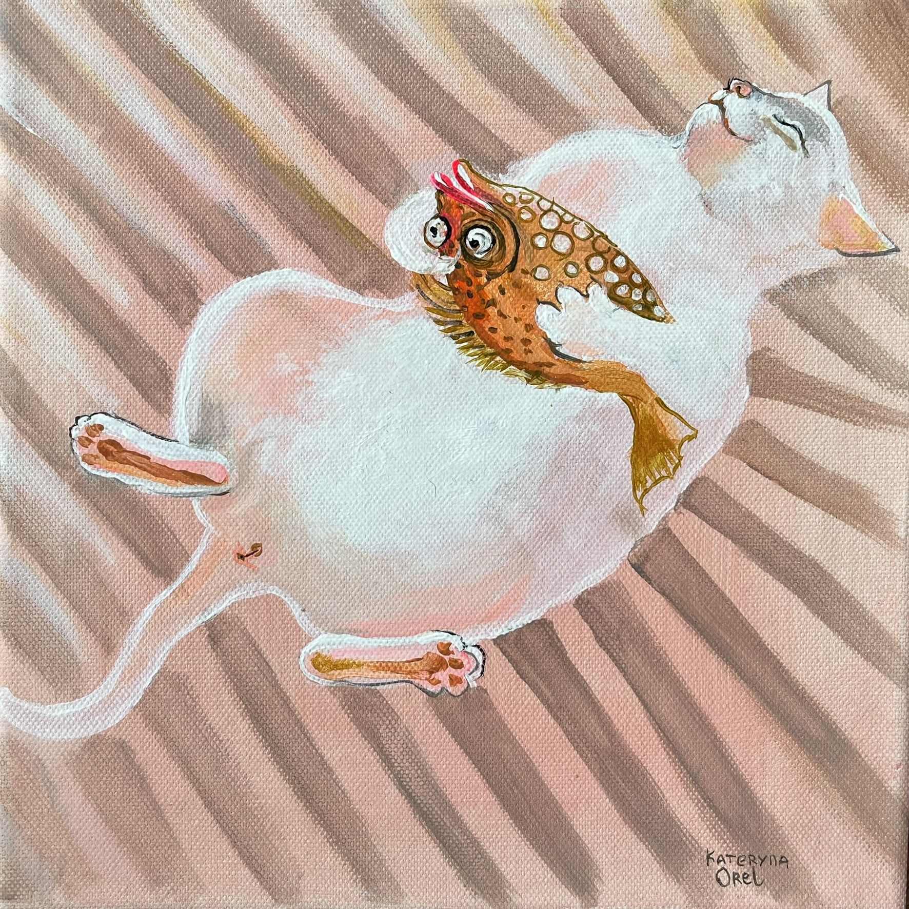 Maľba akrylom na plátne. Čo viac treba k šťastiu. Rúžová mačička zviera v náručí rybu. Rozmer 25x25 cm, nezarámované.