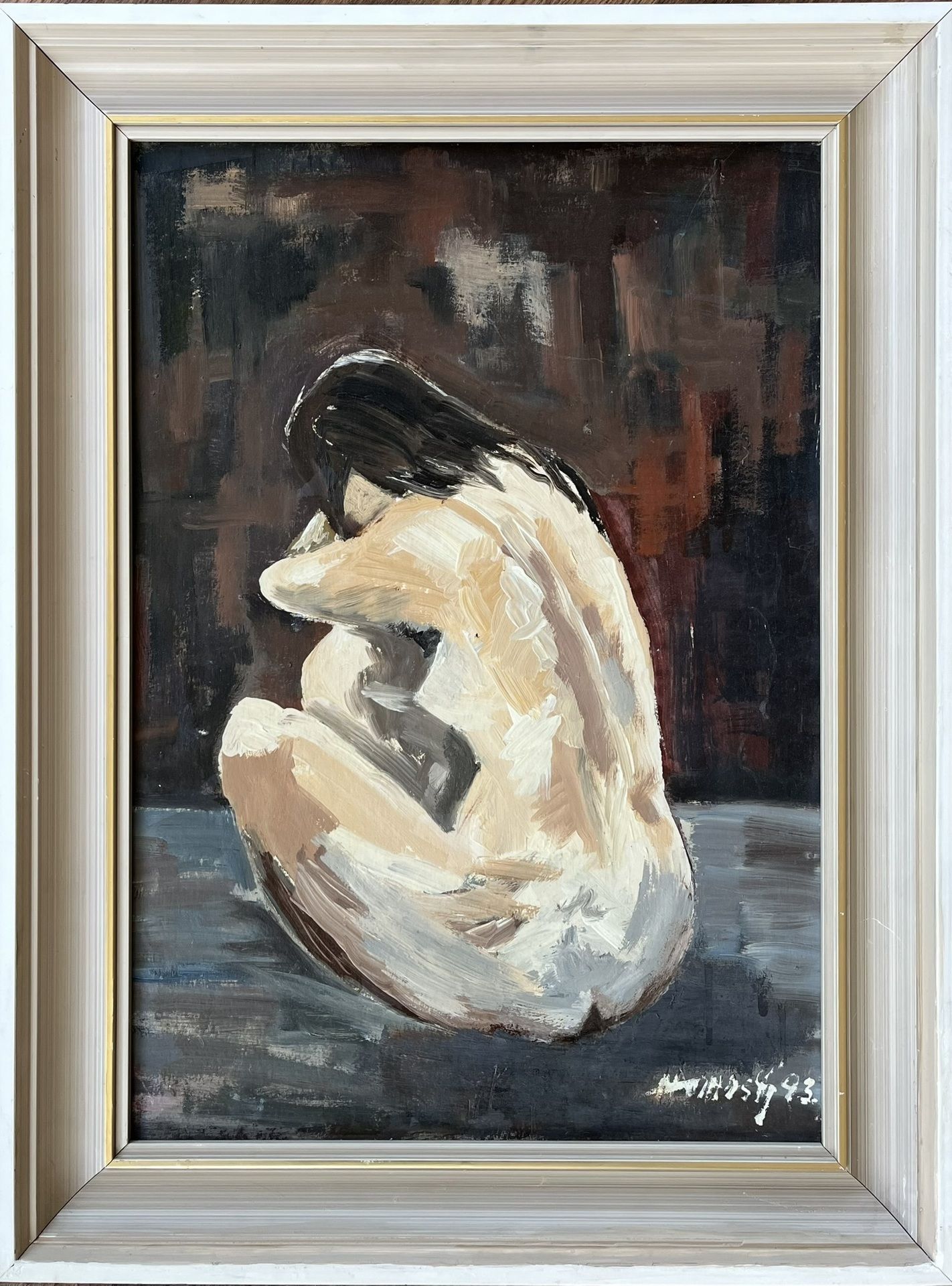 Olejomaľba na sololite, dievča s tmavými vlasmi, rozmer diela je 50x35 cm, zarámované 60x45 cm.