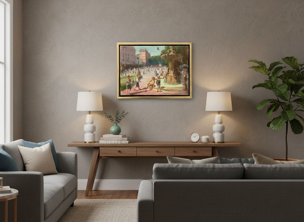 Originálna olejomaľba na plátne — 24 × 33 cm (so rámom 27 × 36 cm). Olejomaľba evokuje pokojnú atmosféru mesta zaliateho popoludňajším slnkom. Pokojná scéna s jemnými ťahmi štetca a príjemnou paletou teplých farieb.