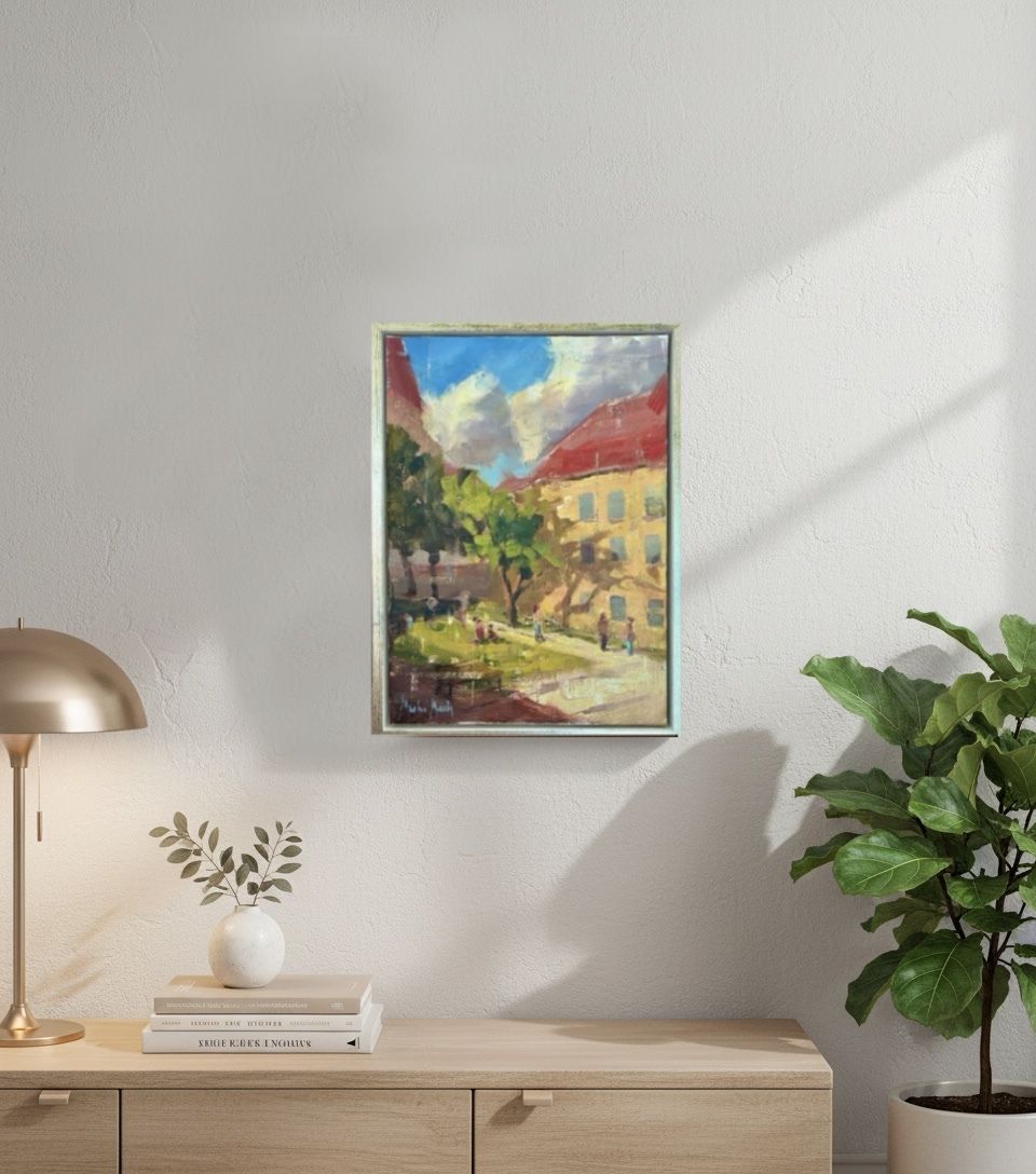Rudnayovo námestie - Ručne maľovaná olejomaľba na plátne – originálny autorský kus, s krásnym zobrazením bratislavského námestia, s využitím viditeľnej štruktúry štetca a jemných farieb. Maľba evokuje pokojnú atmosféru námestia zaliateho slnečným svetlom. Rozmery plátna 33 × 24 cm, so zarámovaním 36 × 27 cm. Maľba je zarámovaná a pripravená na zavesenie; výborný doplnok do bytu, kancelárie alebo ako jedinečný darček pre milovníkov umenia.