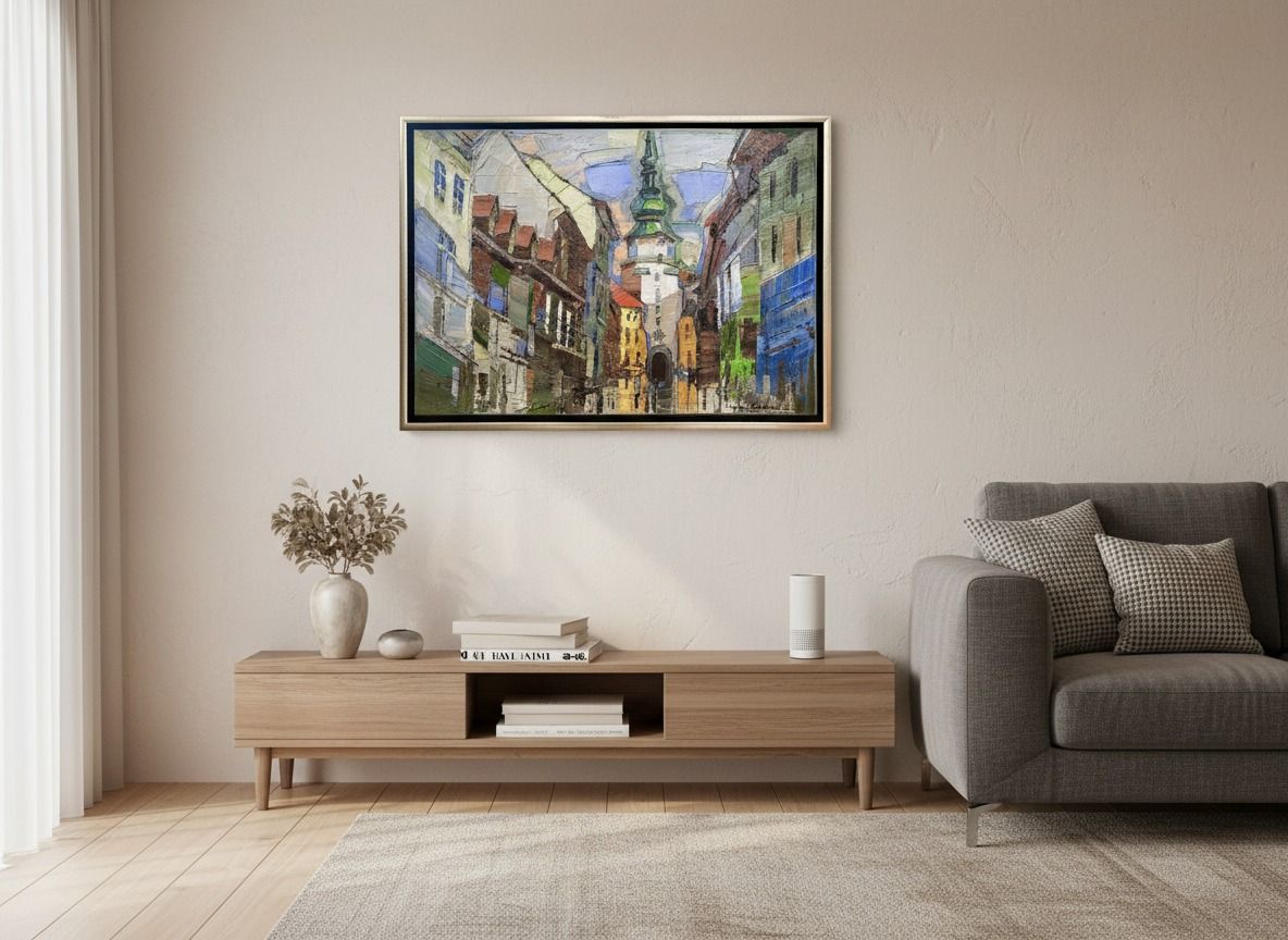 Originálna olejomaľba na plátne so zobrazením Bratislavy, Starého mesta. Zarámovaná v elegantnom ráme – ideálna ako dizajnový doplnok do interiéru alebo ako zaujímavý zberateľský kúsok. Rozmery diela: 50 x 70 cm, s rámom 55 x 75 cm. Obraz je pripravený na zavesenie a vďaka kvalitnému rámu pôsobí okamžite reprezentatívne.