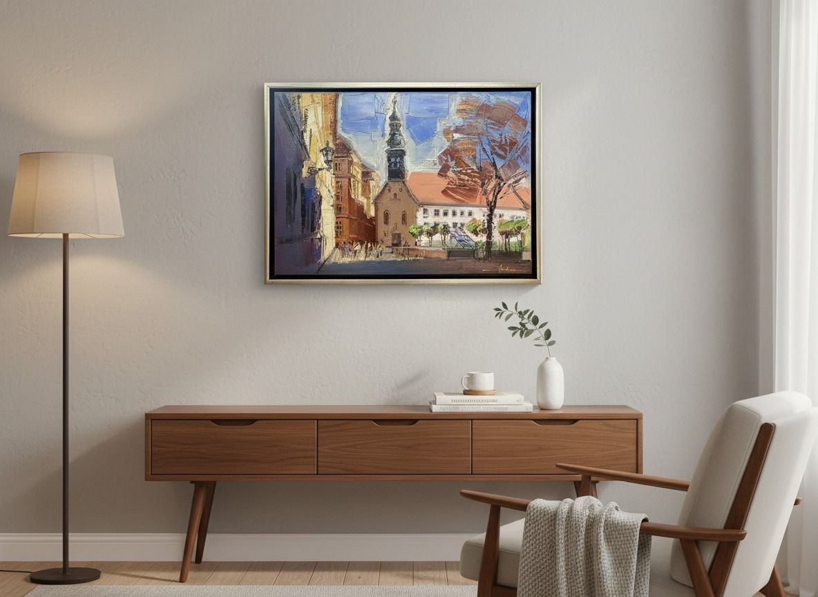 Autorská olejomaľba na plátne „Uršulínky“ – atmosférické zobrazenie ranného mesta, zarámované v elegantnom ráme. Rozmer samotného diela je 50 x 70 cm, so rámom 55 x 75 cm; obraz je pripravený na zavesenie a skvele doplní moderný aj klasický interiér.