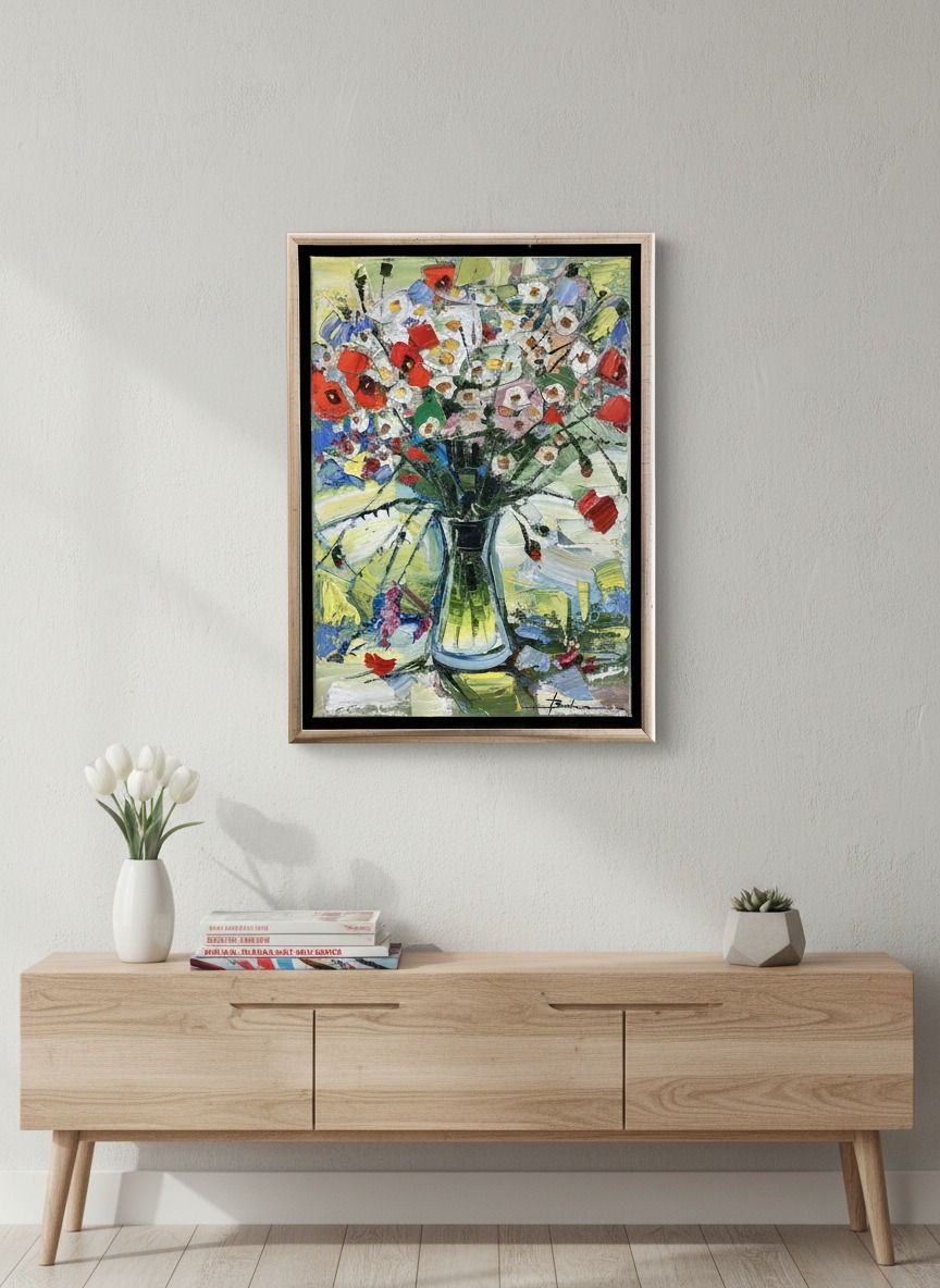Zátišie 1 - originálna olejomaľba, rozmer plátna 50 × 35 cm, v elegantnom ráme je celkový rozmer 55 × 40 cm — obraz je hotový na zavesenie a okamžite oživí interiér. Jemná technika, jasné farby a precízne zarámovanie robia z tohto diela hodnotný doplnok do zbierky alebo výnimočný dar.