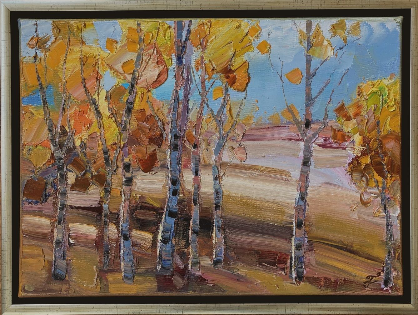 Les v neskorých jesenných farbách, olejomaľba rámovaná v peknom ráme. Rozmer diela je 40 x 55 cm, zarámované 45 x 60 cm.