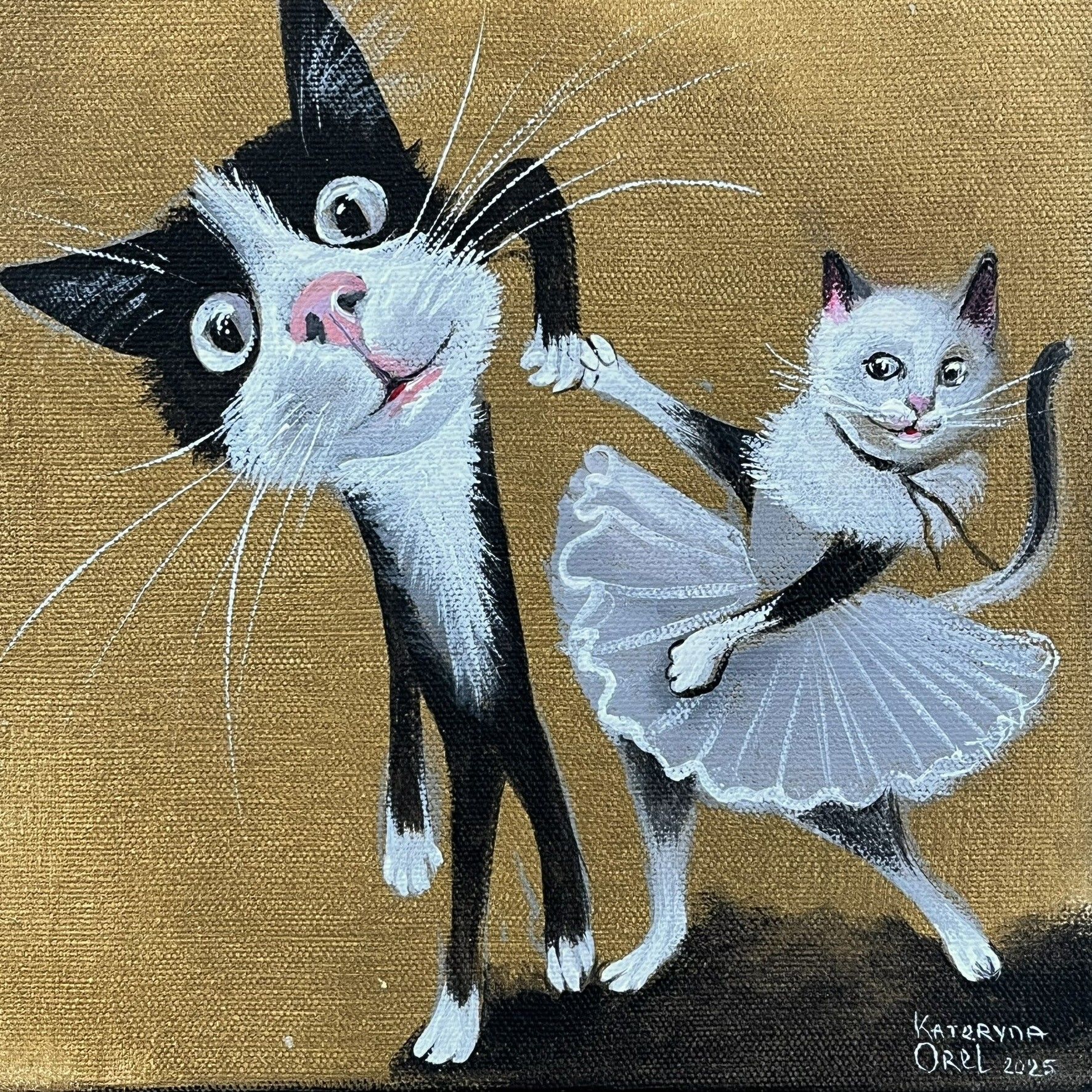 Mačička a kocúrik pri veselom tanci, maľba akrylom 20x20 cm, nezarámované.