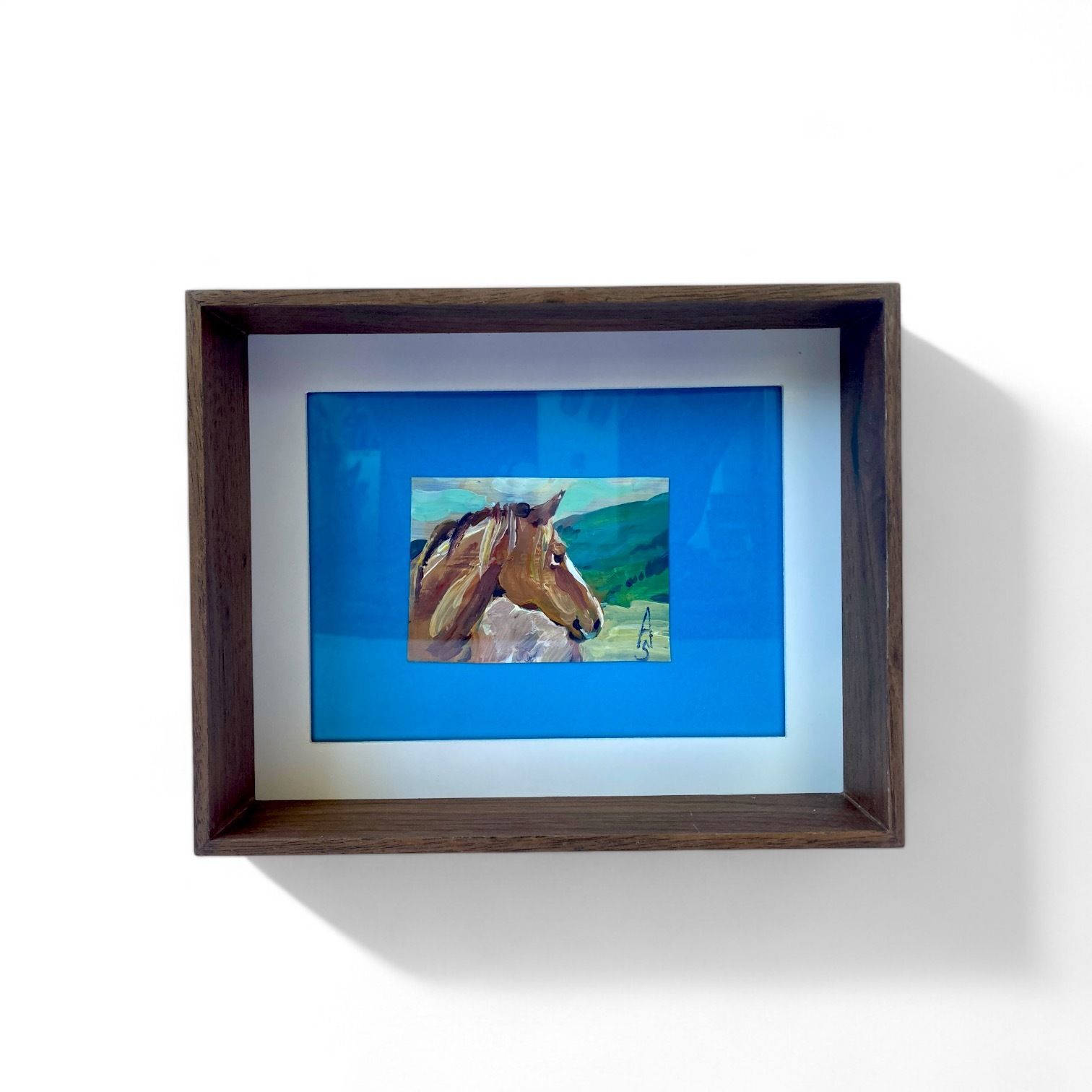 Olejomaľba, malý obrázok hlavy koňa, rozmer 8 x 11 cm, zarámované 20 x 25 cm.