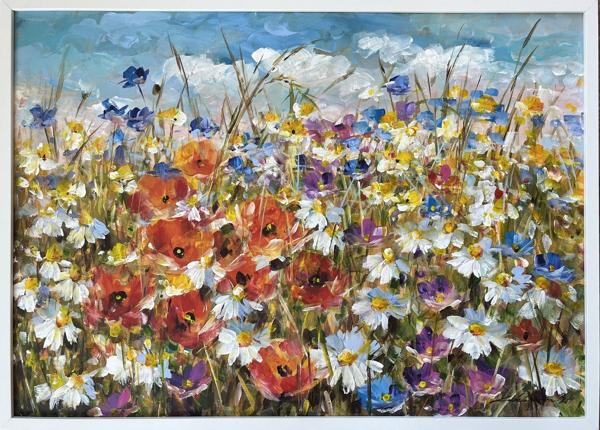 Akryl na sololite, Lúka plná rozkvitnutých kvetov, rozmer 29x39 cm, zarámované 42x52 cm.