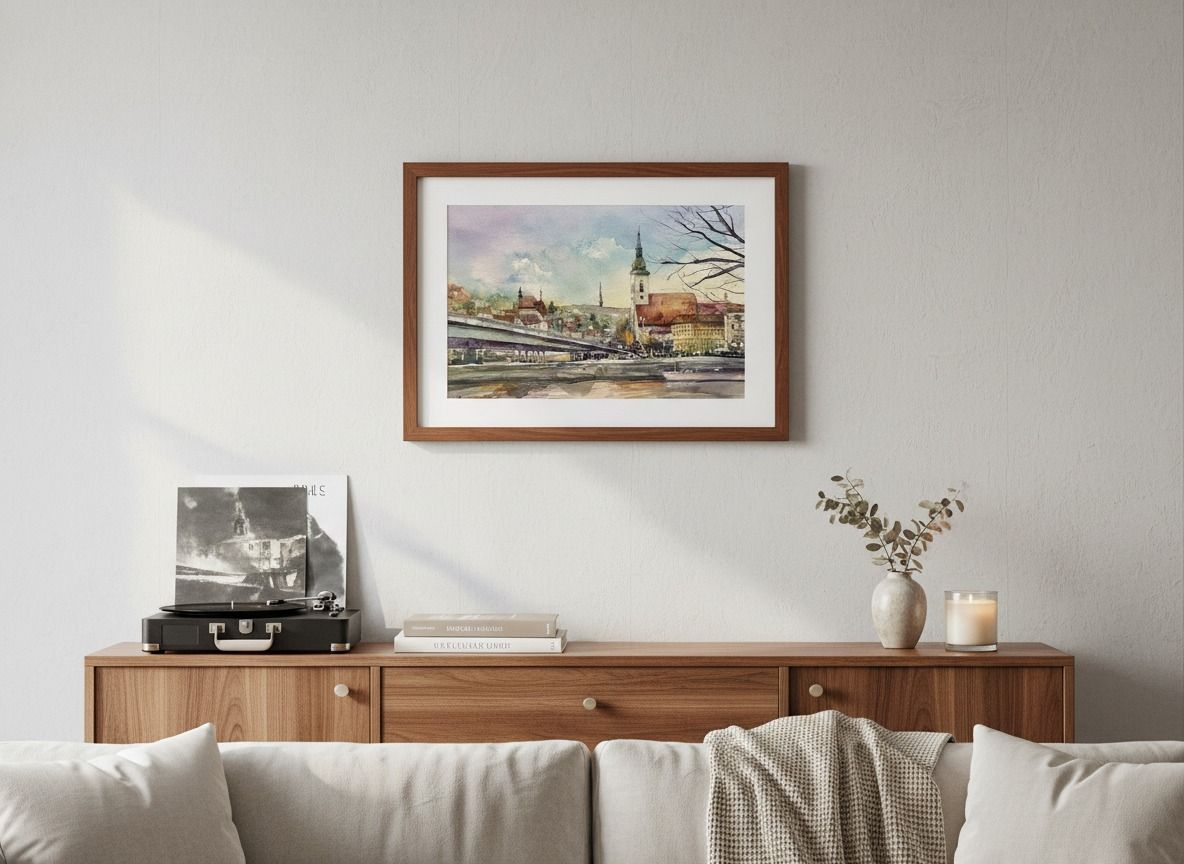 Pohľad na centrum mesta Bratislavy s príjemnou atmosférou a zaujímavou kompozíciou. Jemné prepojenie farieb a autorský rukopis robia z tohto kusu výnimočný doplnok do interiéru alebo originálny darček.