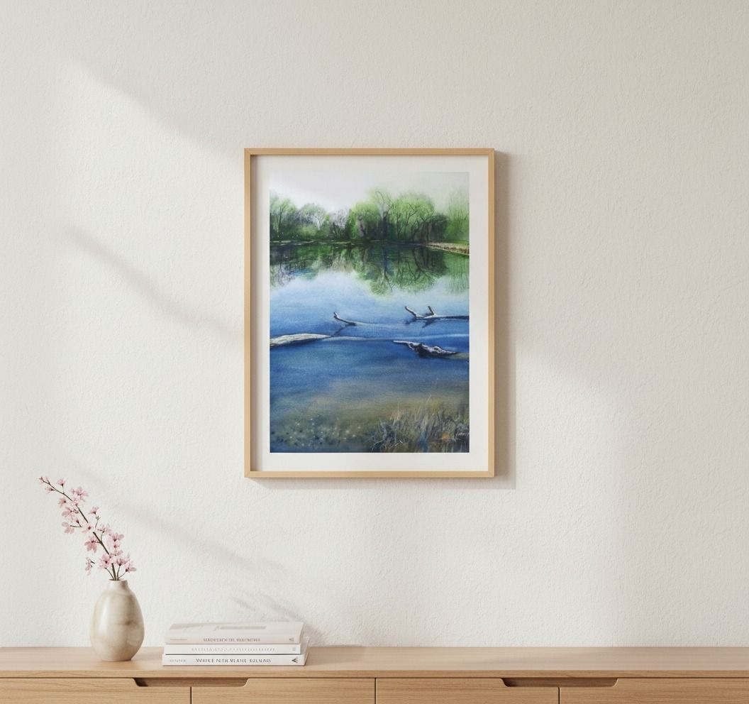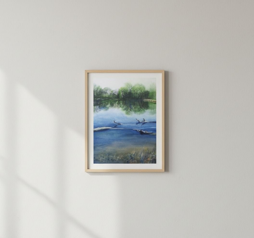 Originálna akvarelová maľba, rozmery diela 30 × 25 cm, zarámované: 47 × 37 cm. Jemné farby a precízne detailné spracovanie robia z tohto kusu ideálny doplnok do interéru. Dielo vyniká detailným spracovaním a zároveň ľahkosťou techniky akvarelu. Autorka zobrazuje odlesky prírody na zrkadlovej hladine jazera pomocou jemných ťahou štetca a akvarelových farieb.