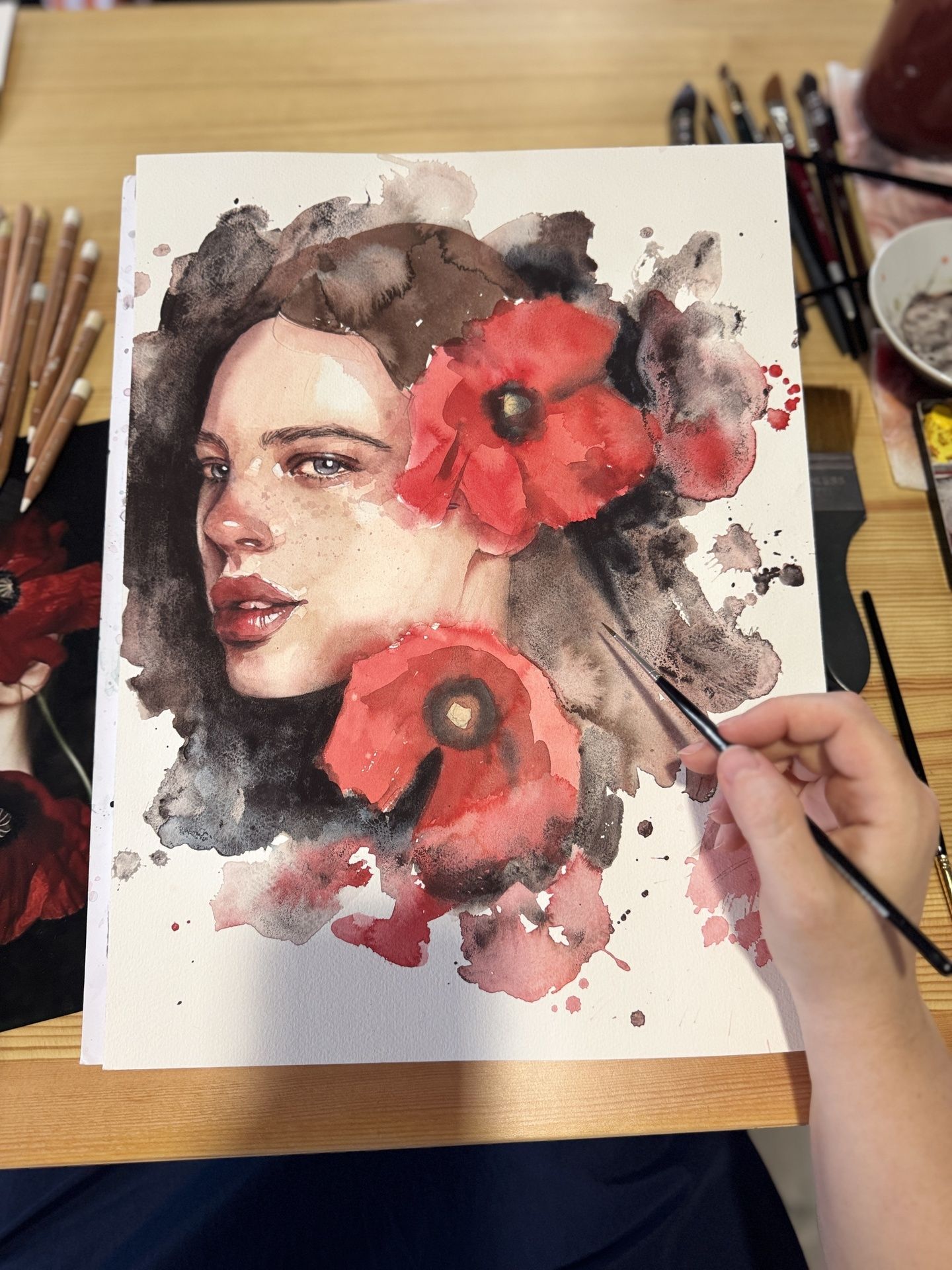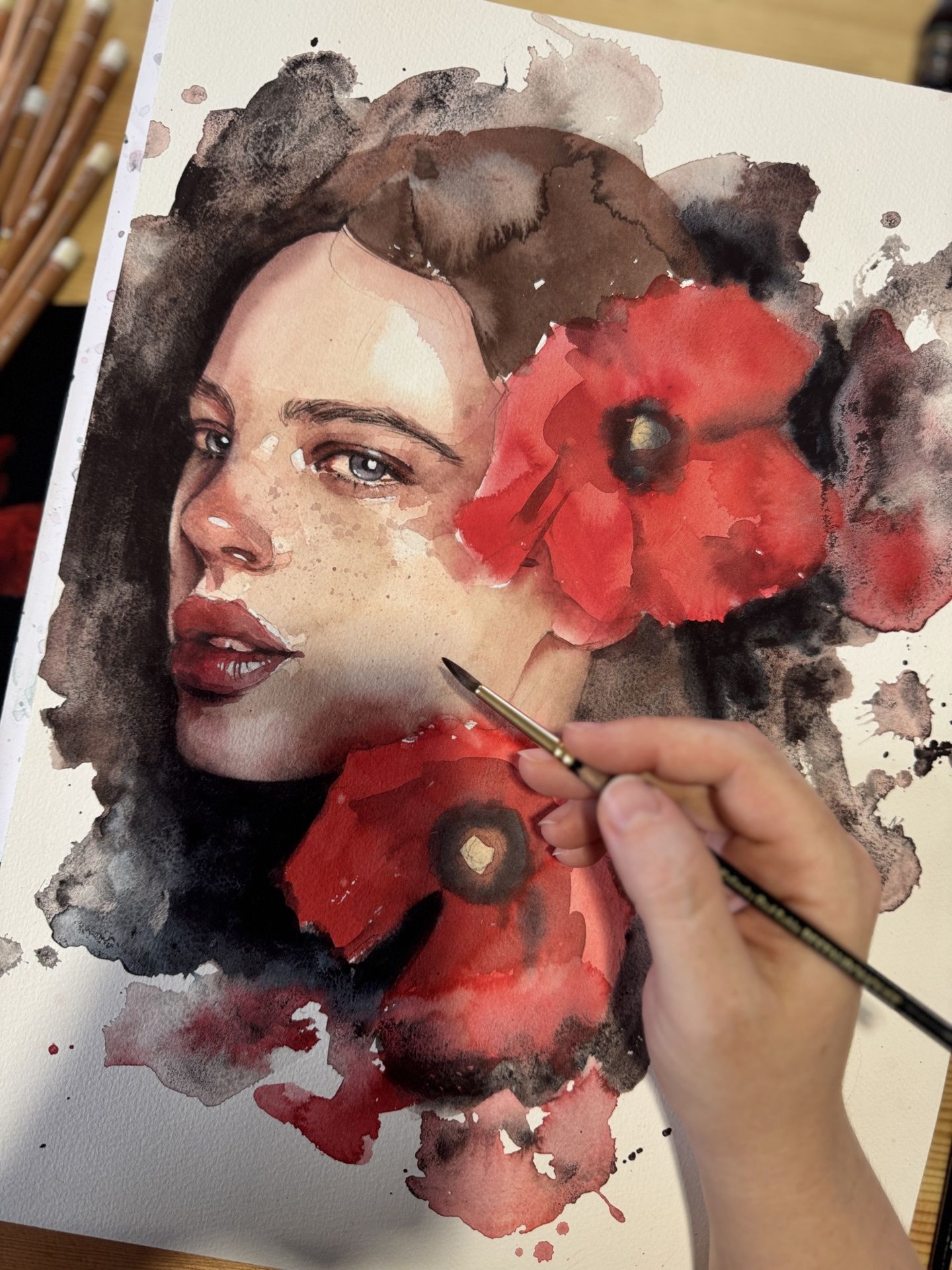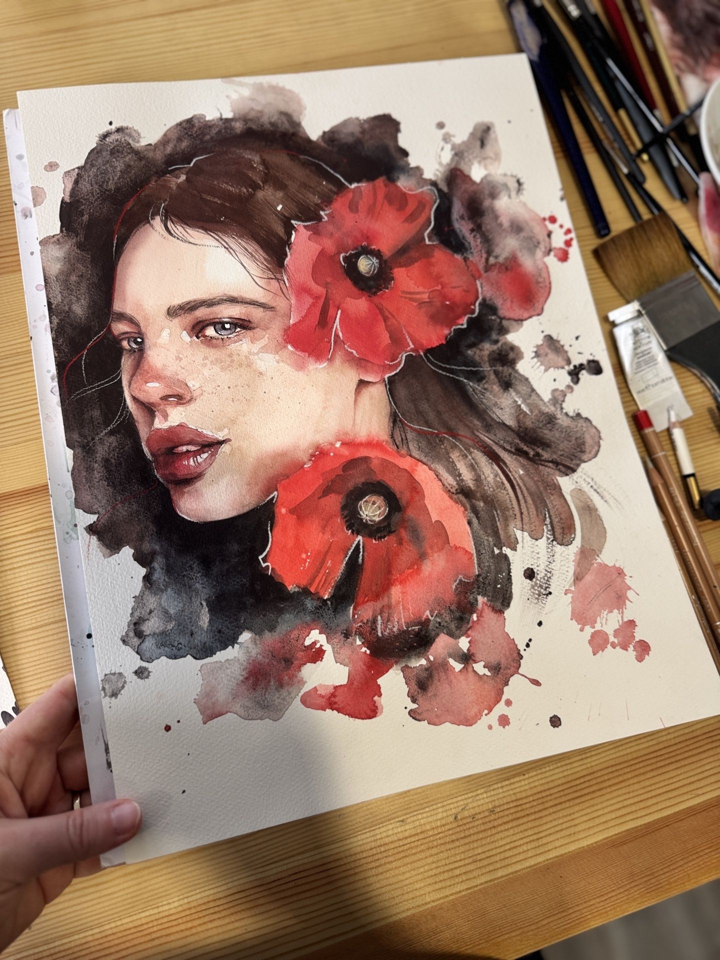 Akvarel, hnedovláska s červeným makom vo vlasoch, rozmer diela 40x30 cm v bordovej pasparte 50x40 cm.