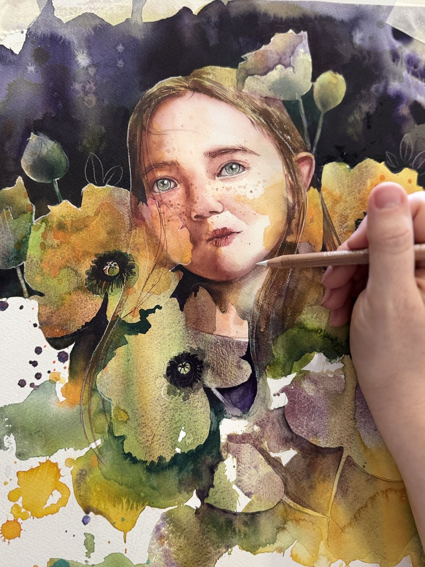 Akvarel, blondýnka s pehame v zajatí žltých makov. Rozmer diela 40x30 cm v čiernej pasparte 50x40 cm.